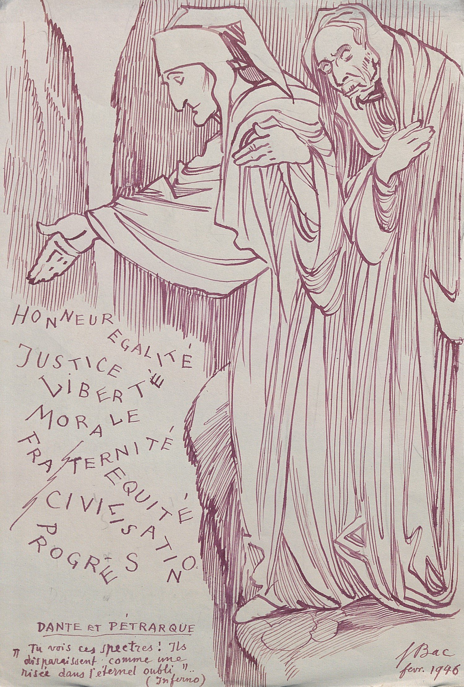 Dante et Pétrarque, encre, sur papier, signé en bas à droite et daté 1946, légendé, 31 x 21 cm ;