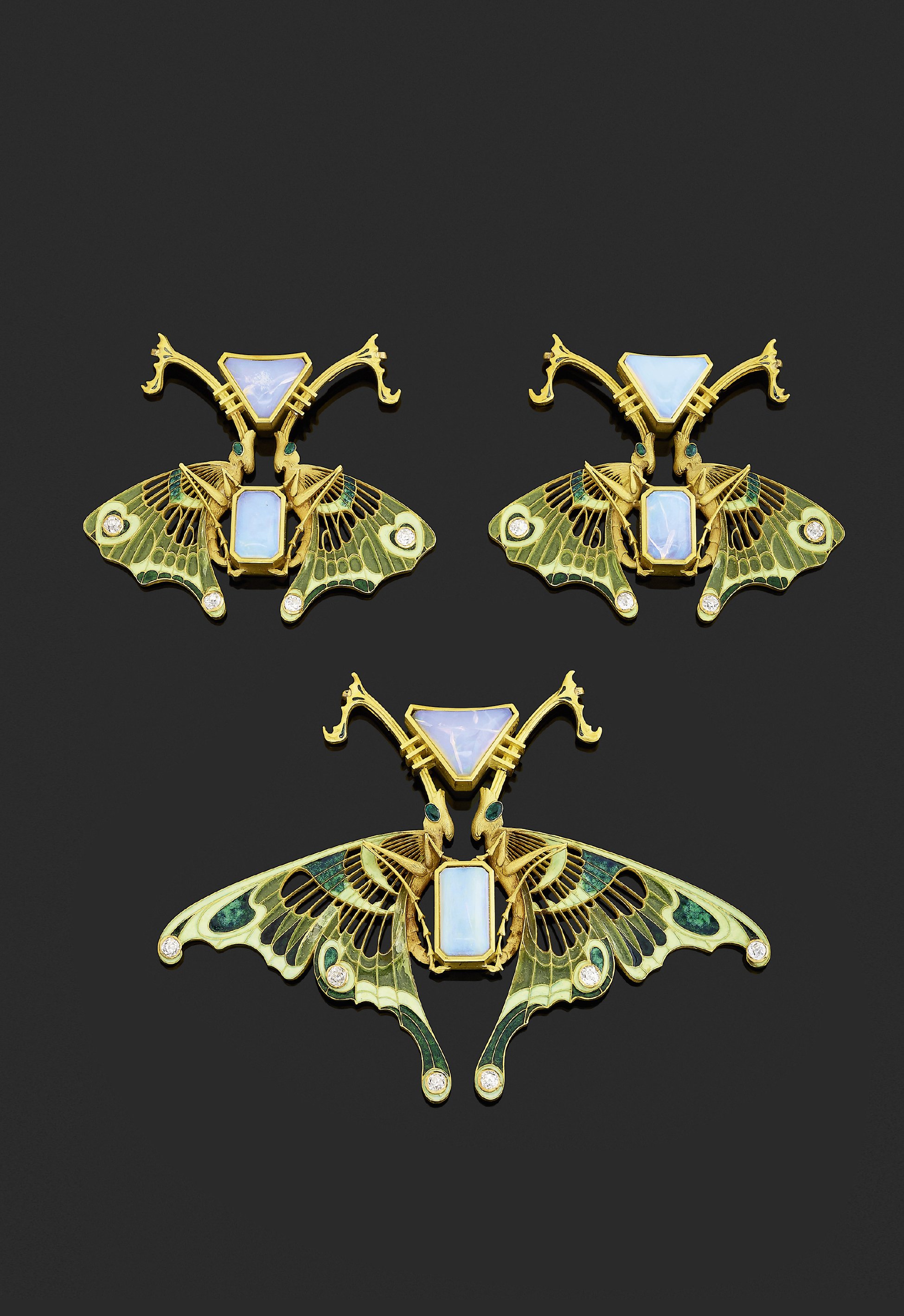 De même modèle, un de taille plus importante, chaque motif figure deux papillons gravés et ajourés, les ailes émaillées en polychromie et en plique-à-jour, serties de diamants ronds de taille ancienne, les pattes et les antennes retenant des opales de forme cabochon serties clos, les yeux émaillés verts.