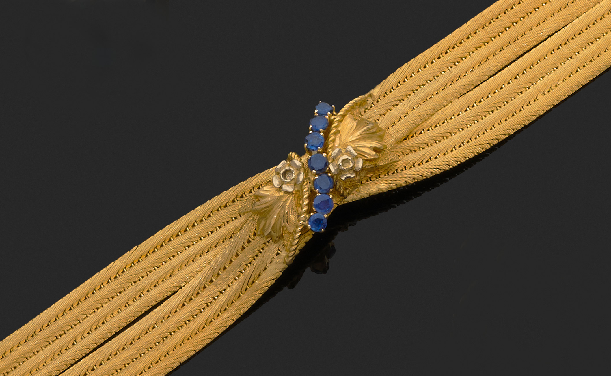 Or jaune 750 millièmes, le centre figurant un nœud décoré de feuillages et serti d'une ligne de saphirs ronds.