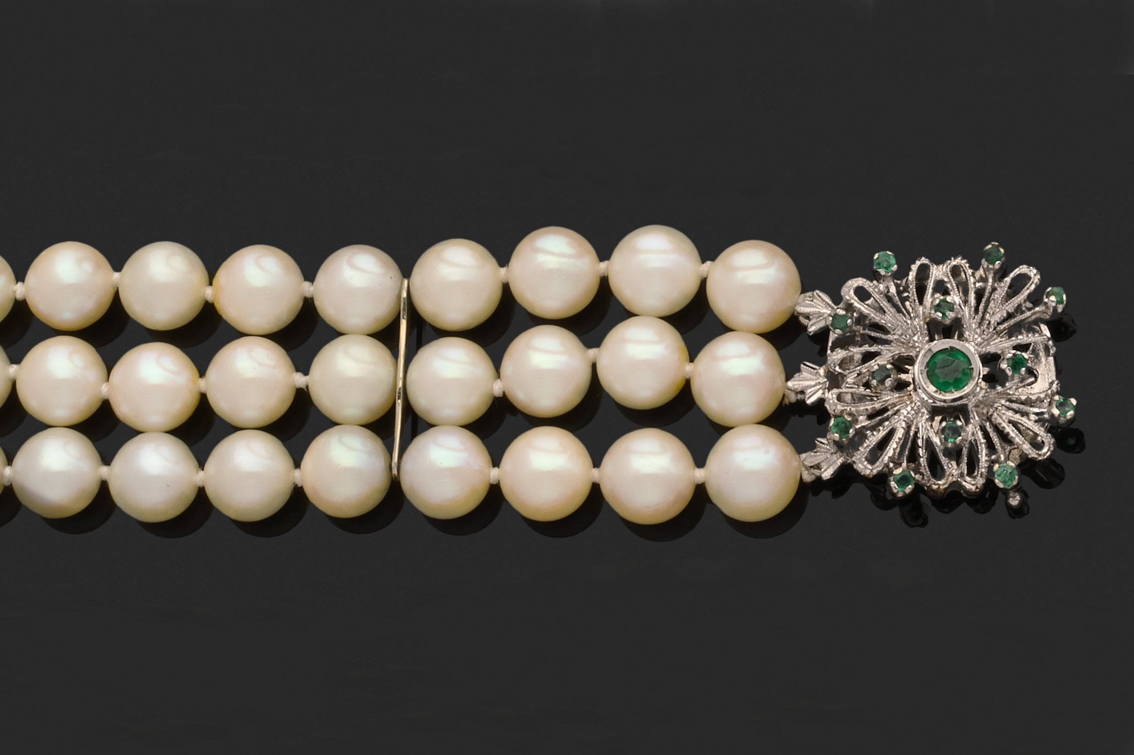 Perles de culture, le fermoir en or gris 750 millièmes serti de petites émeraudes.