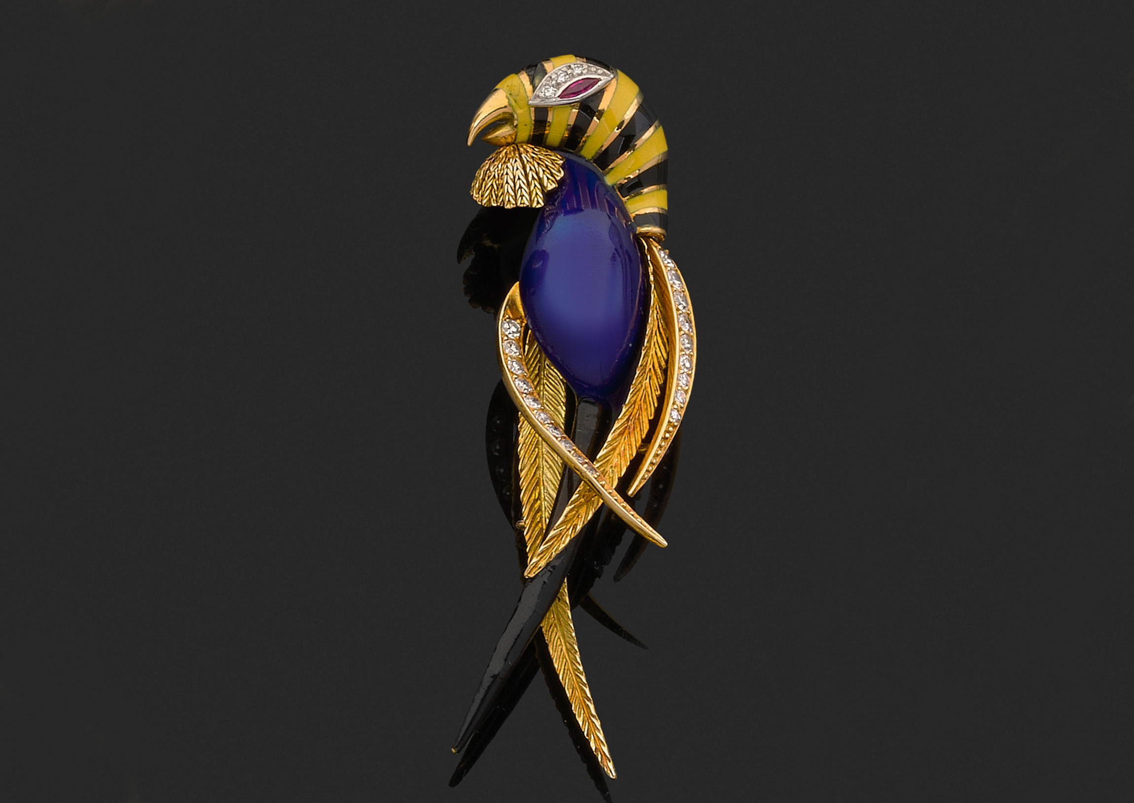 Or jaune 750 millièmes, gravé, émaillé en polychromie et orné de diamants ronds taillés en huit-huit figurant un oiseau exotique. Signé.