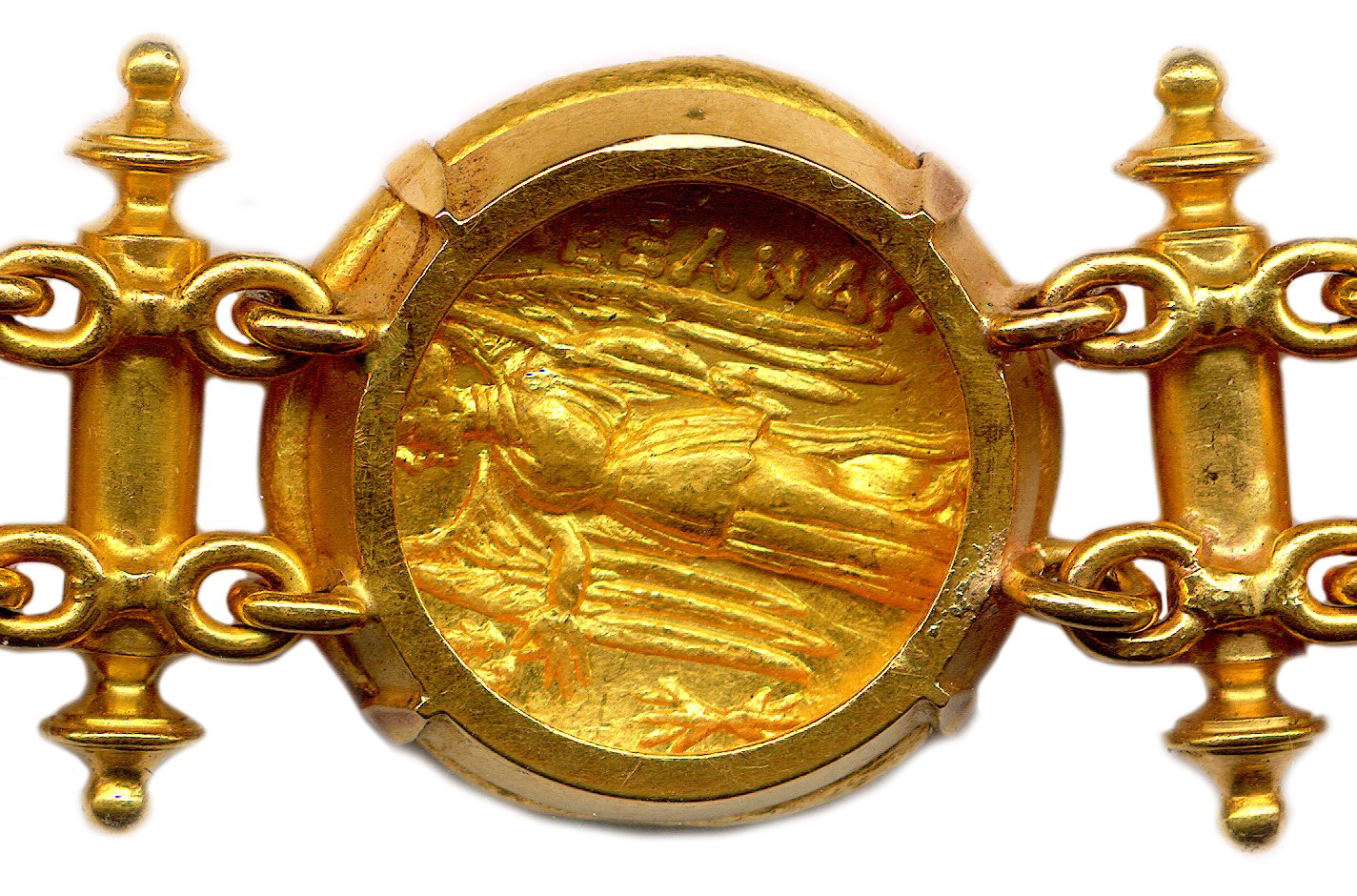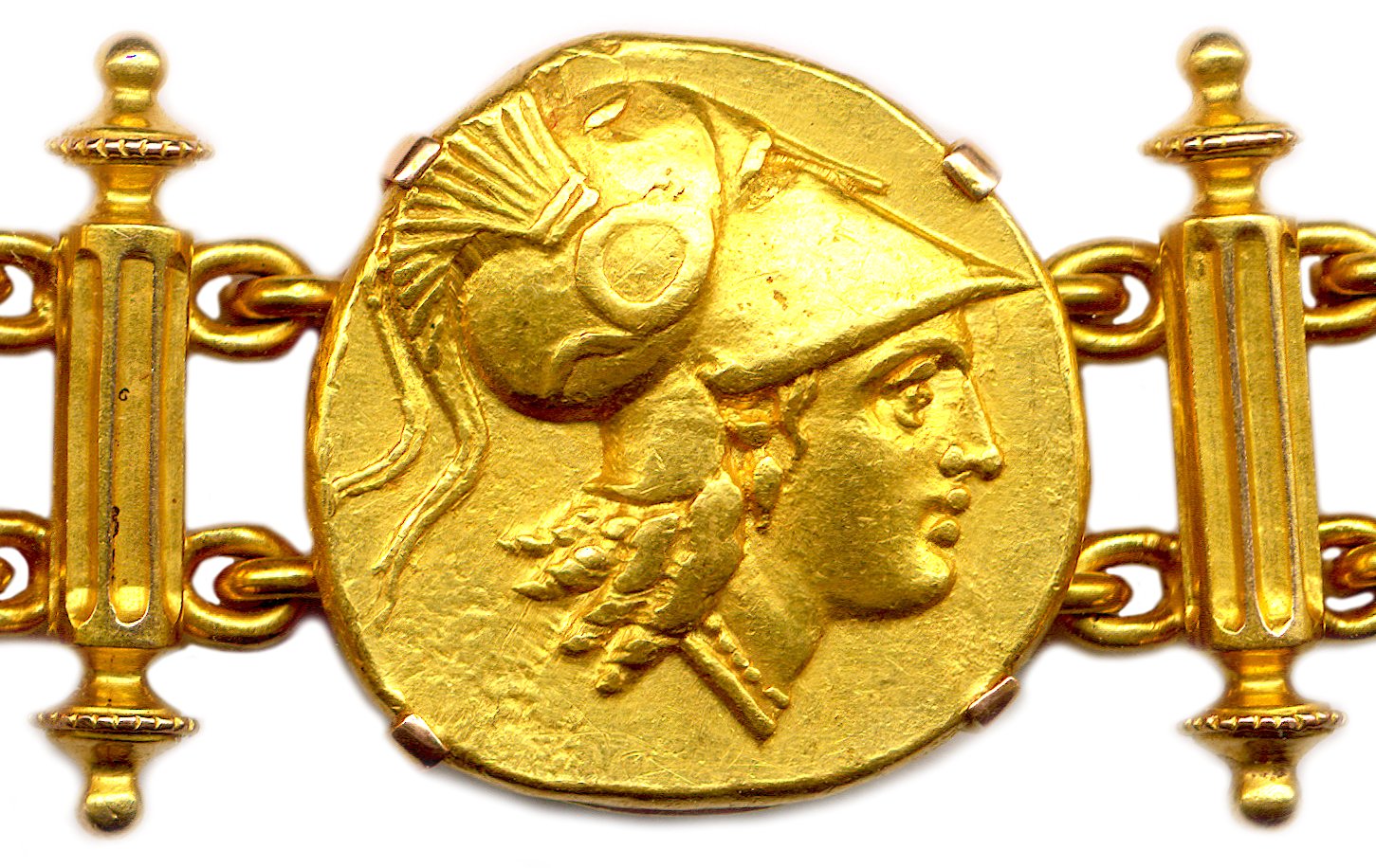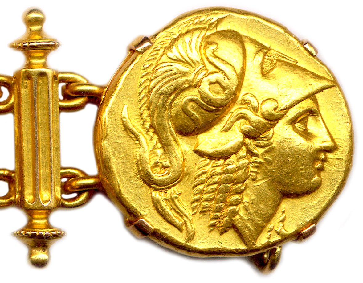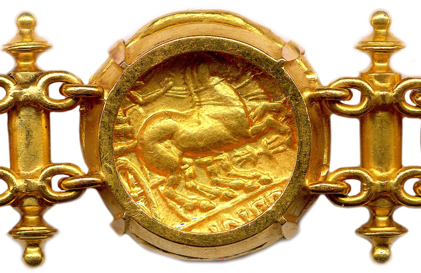 A bracelet made of seven 18K gold staters from the Kingdom of Macedonia. One gold stater of Philip II of Macedon and six gold staters of his son Alexander the Great.