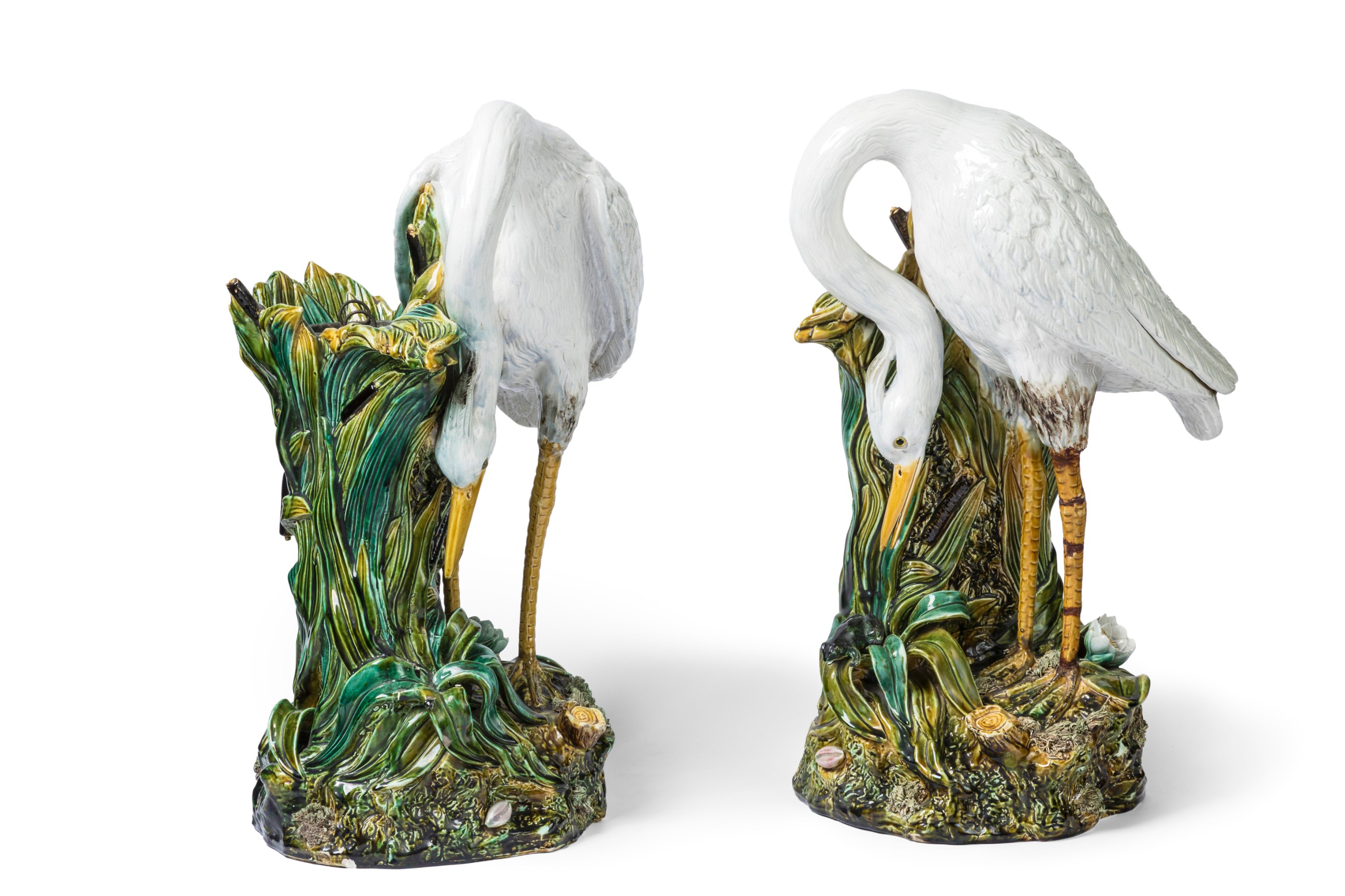 Notre paire de porte-parapluies s'inscrit dans la production de la seconde moitié du XIXe siècle, parmi lesquelles se retrouvent les réalisations de Delphin Massier à Vallauris ou Paul Colomera à Choisy-le-Roi. L'un comme l'autre proposent des compositions où se mêlent des hérons dans un environnement de végétation aquatique. Ce thème dépasse les frontières pour se retrouver également en Angleterre, à la manufacture de Minton.