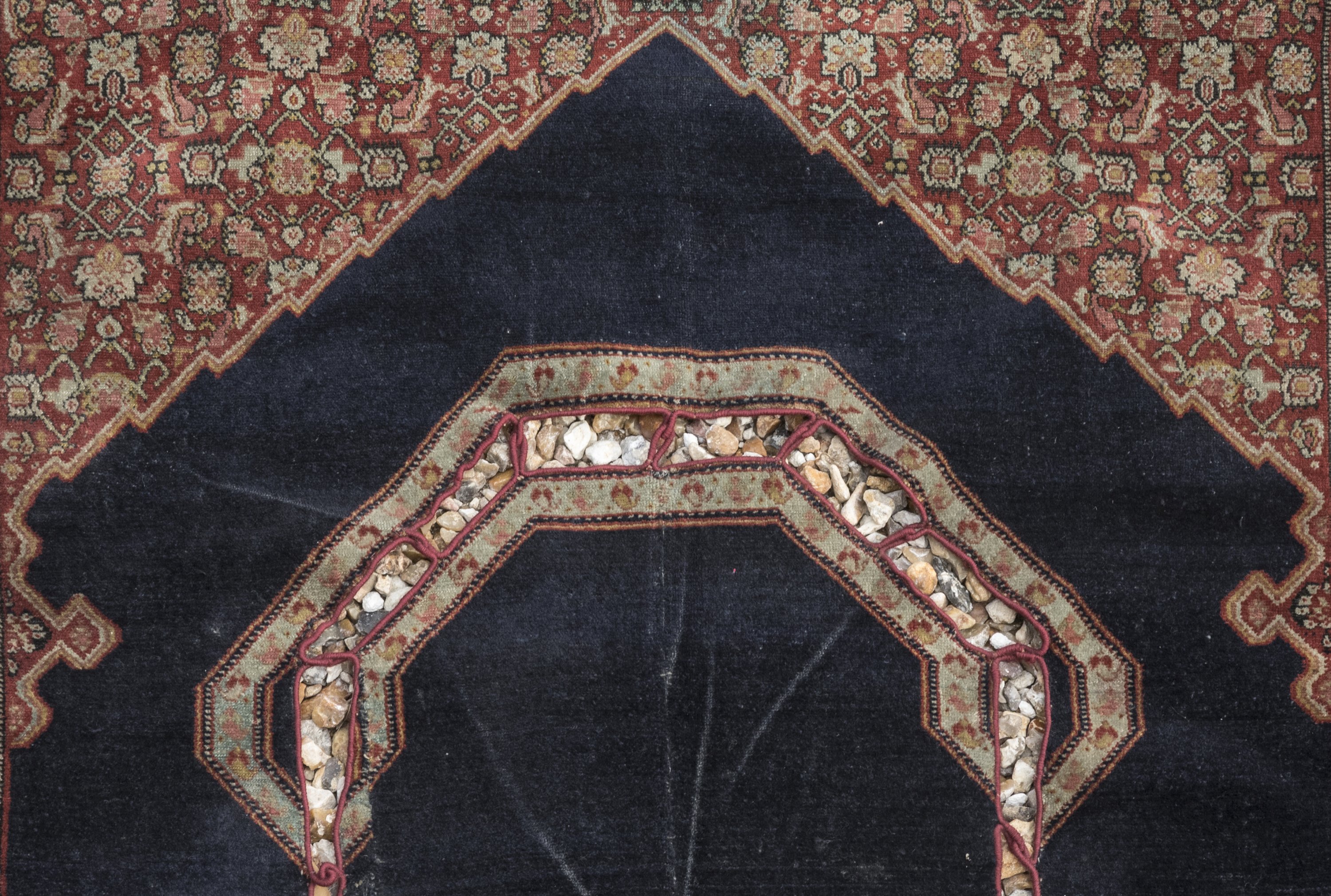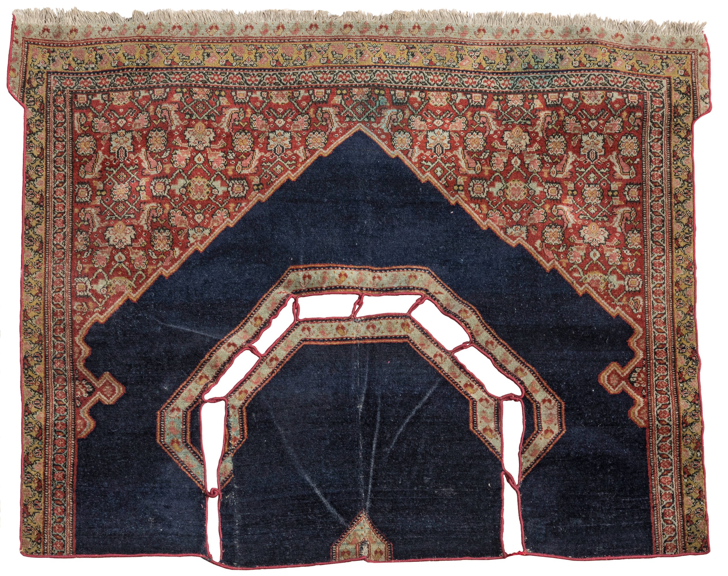 Fond noir, avec ouverture pour la bosse du dromadaire, arcature rouge de fleurs et palmes, bordée d’un double galon.