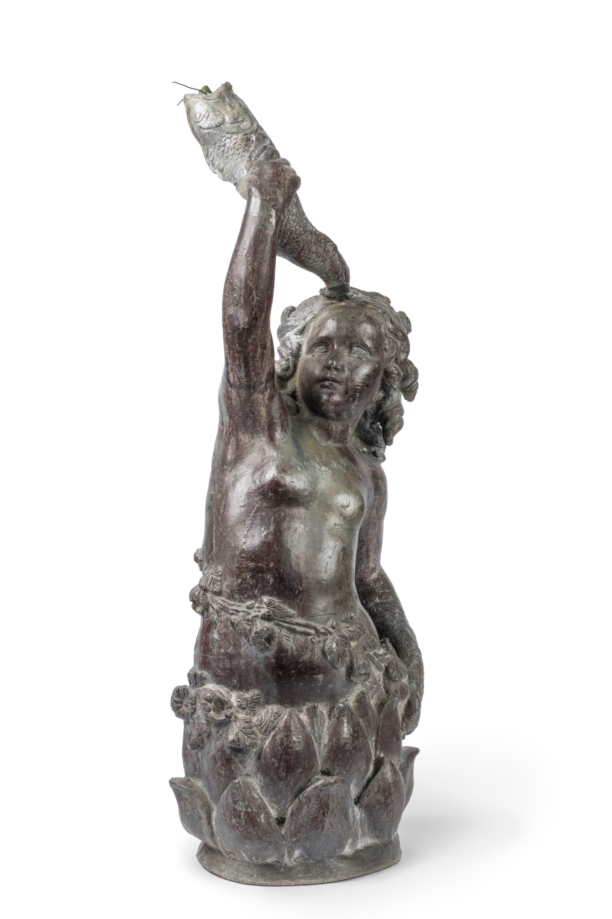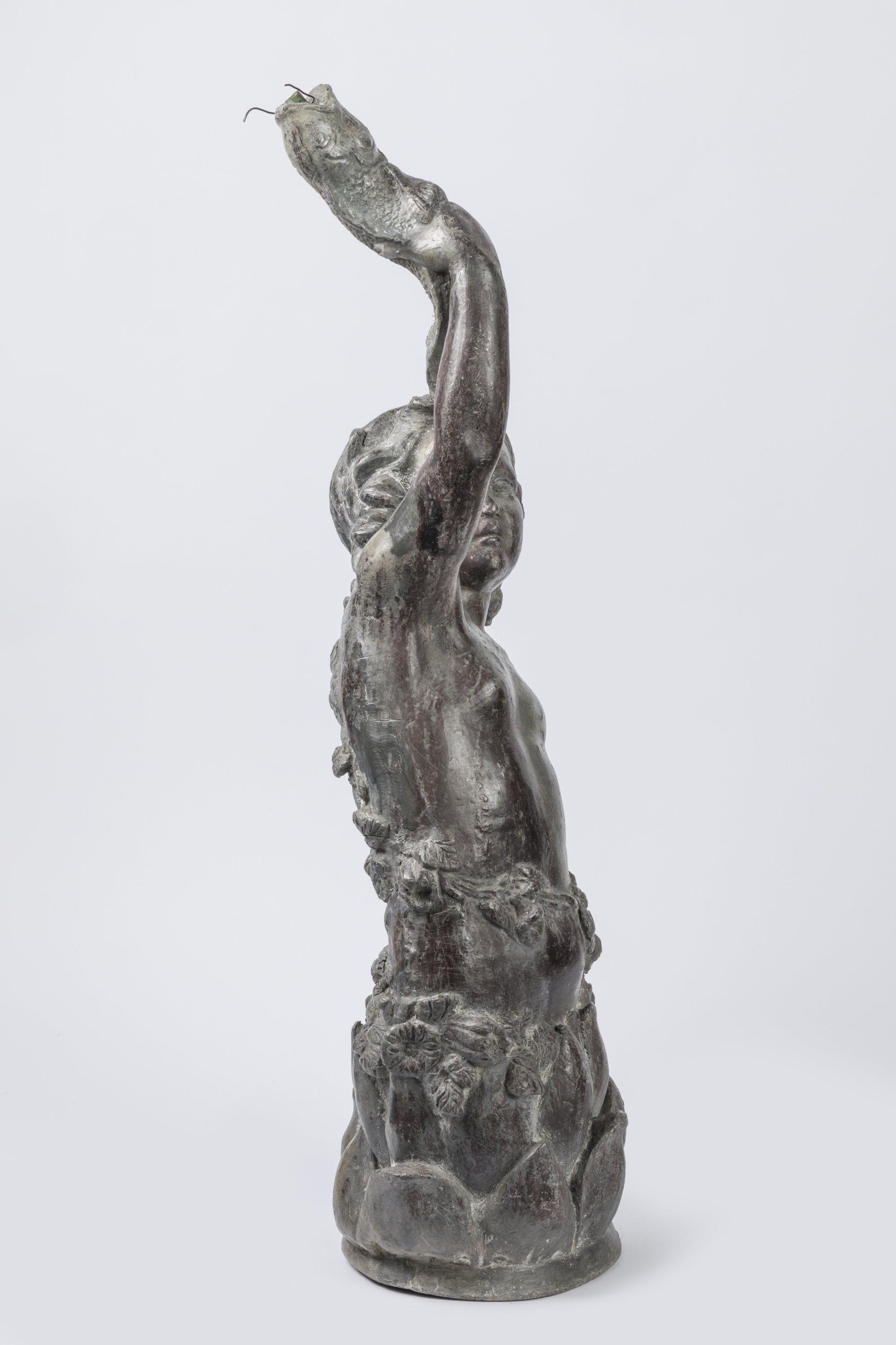 A lead garden fountain in the shape of a child holding a fish. England, 20th century.