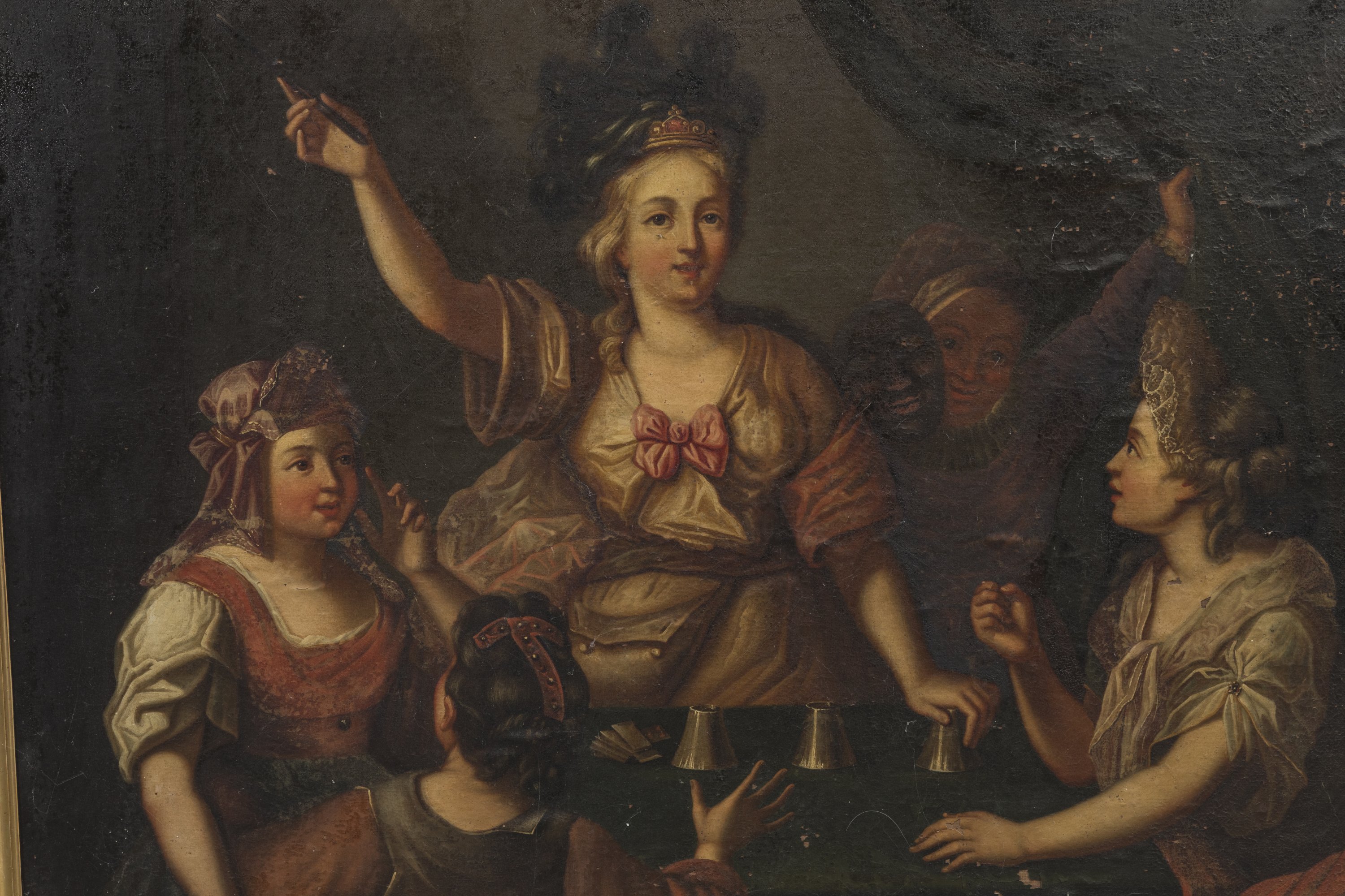 A painting depicting a cups and balls routine after Joseph Christophe. Oil on canvas. French School, 18th century.
