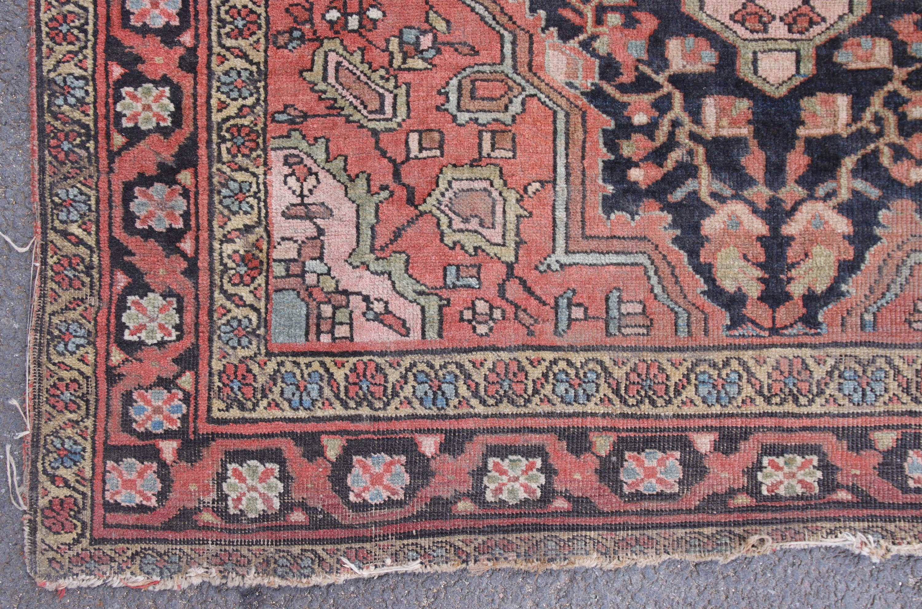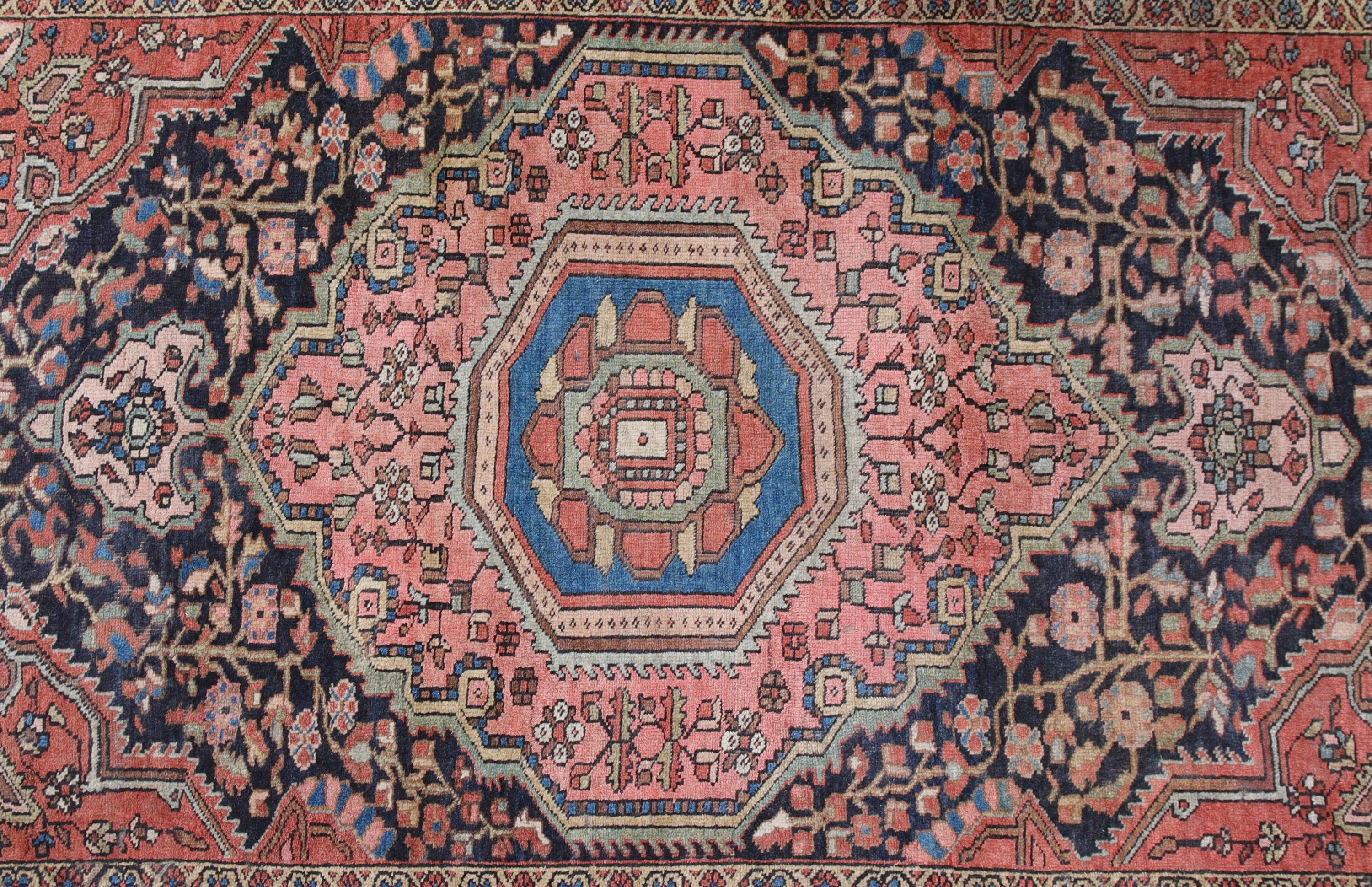 A Northwest Persian rug featuring a pink medallion on a blue background sourrounded by floral branches in red arcades.