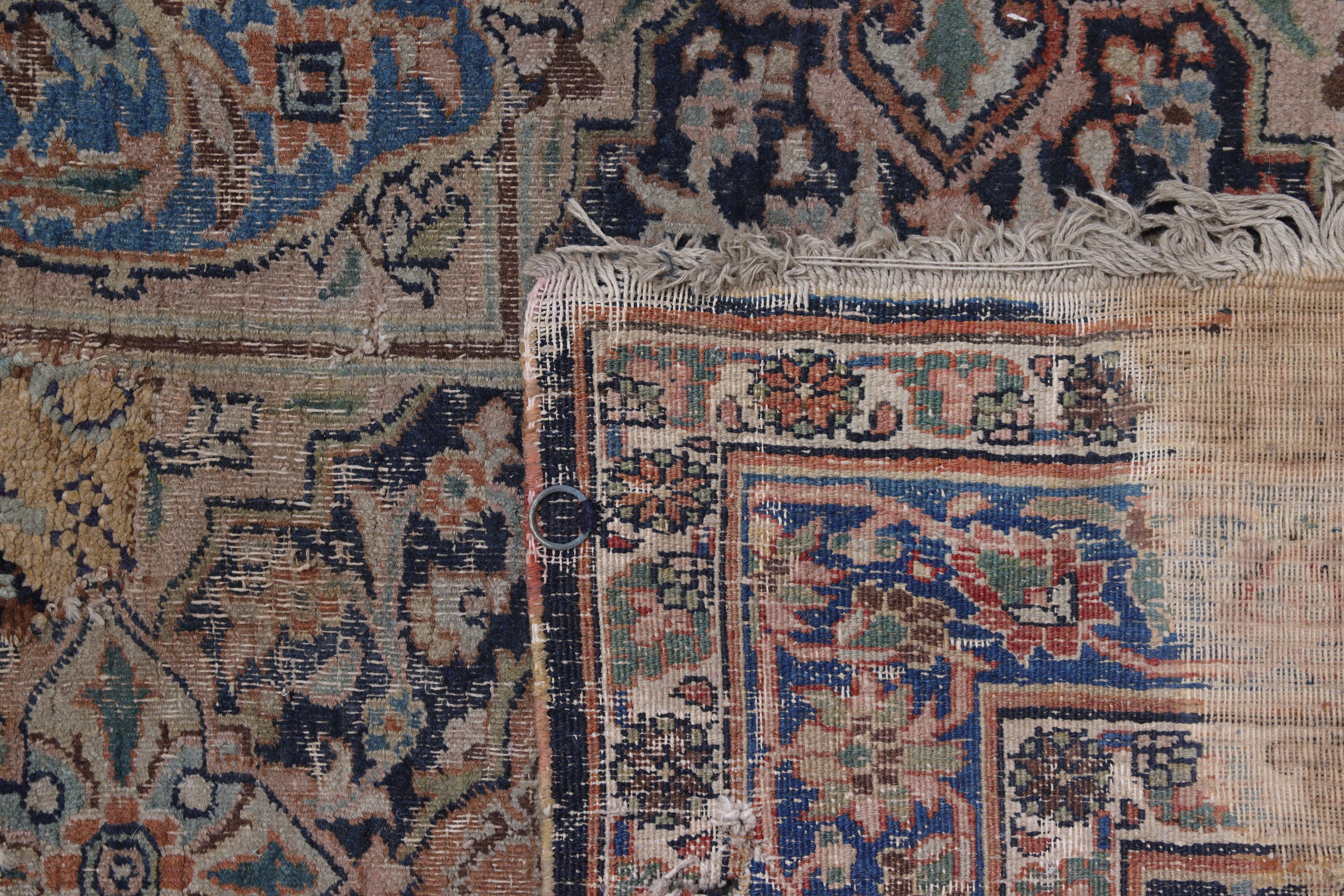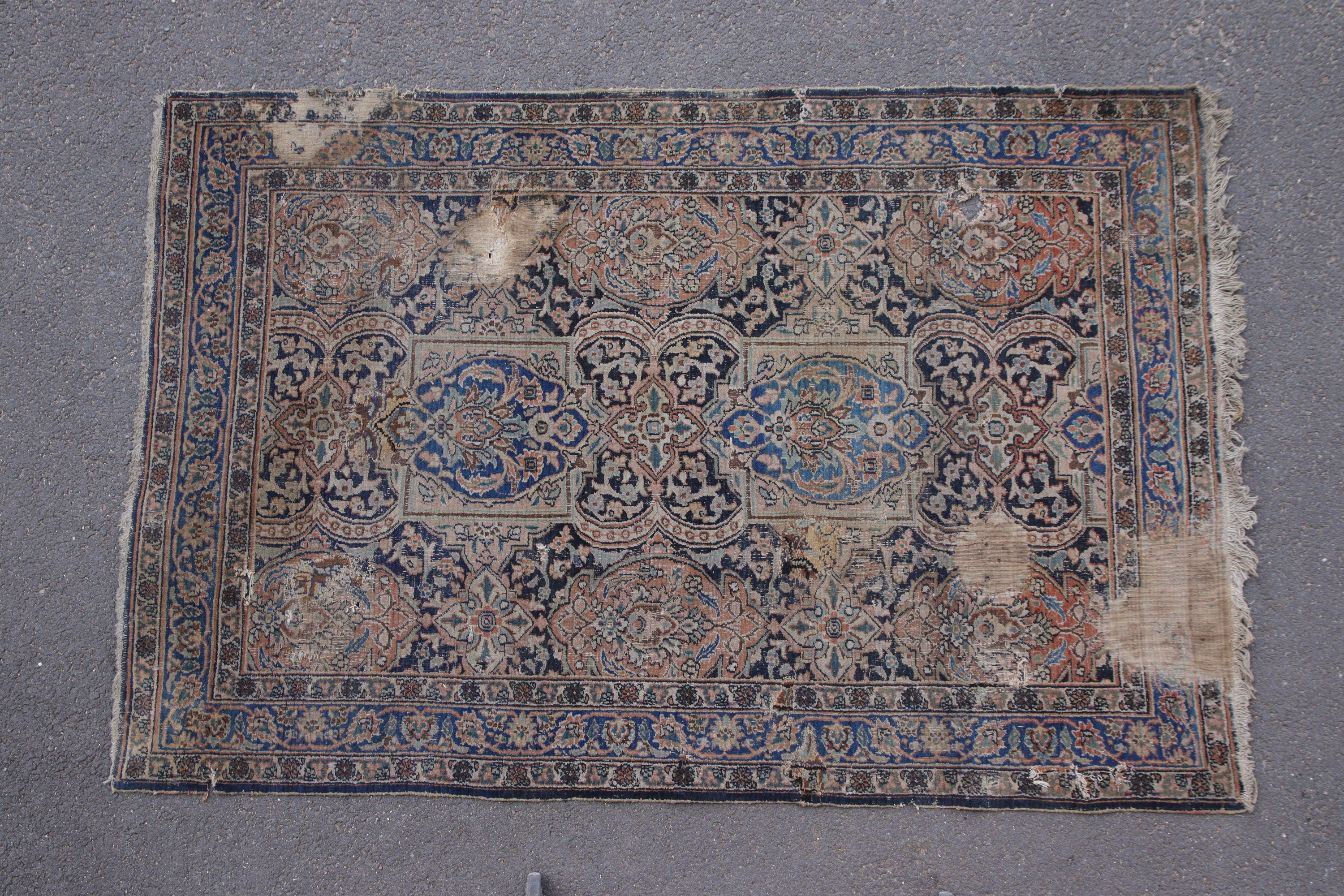 Joint : Tapis Kechan ou Tabriz (?), fond noir, décor de compartiments fleuris, bordure bleue de rinceaux de fleurs. Haut. 127 Long. 192 cm (importantes usures, accrocs).