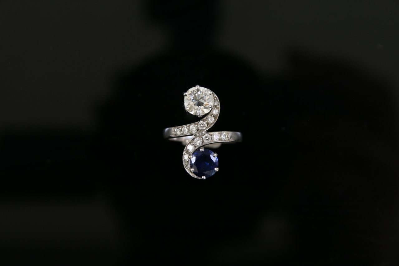 Or gris 750 millièmes, le centre à décor d'entrelacs orné d'un saphir et diamant rond de taille ancienne entre deux lignes de petits diamants ronds de taille brillant. Poids approximatif calculé du diamant : 1.20/1.50 carat.