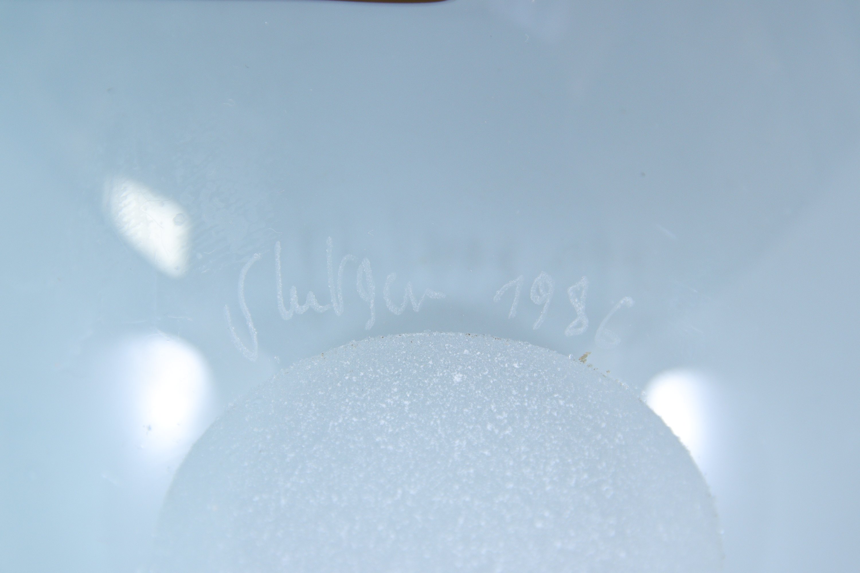 Verre teinté céladon et rose et décor de lignes libres en émail peint.
