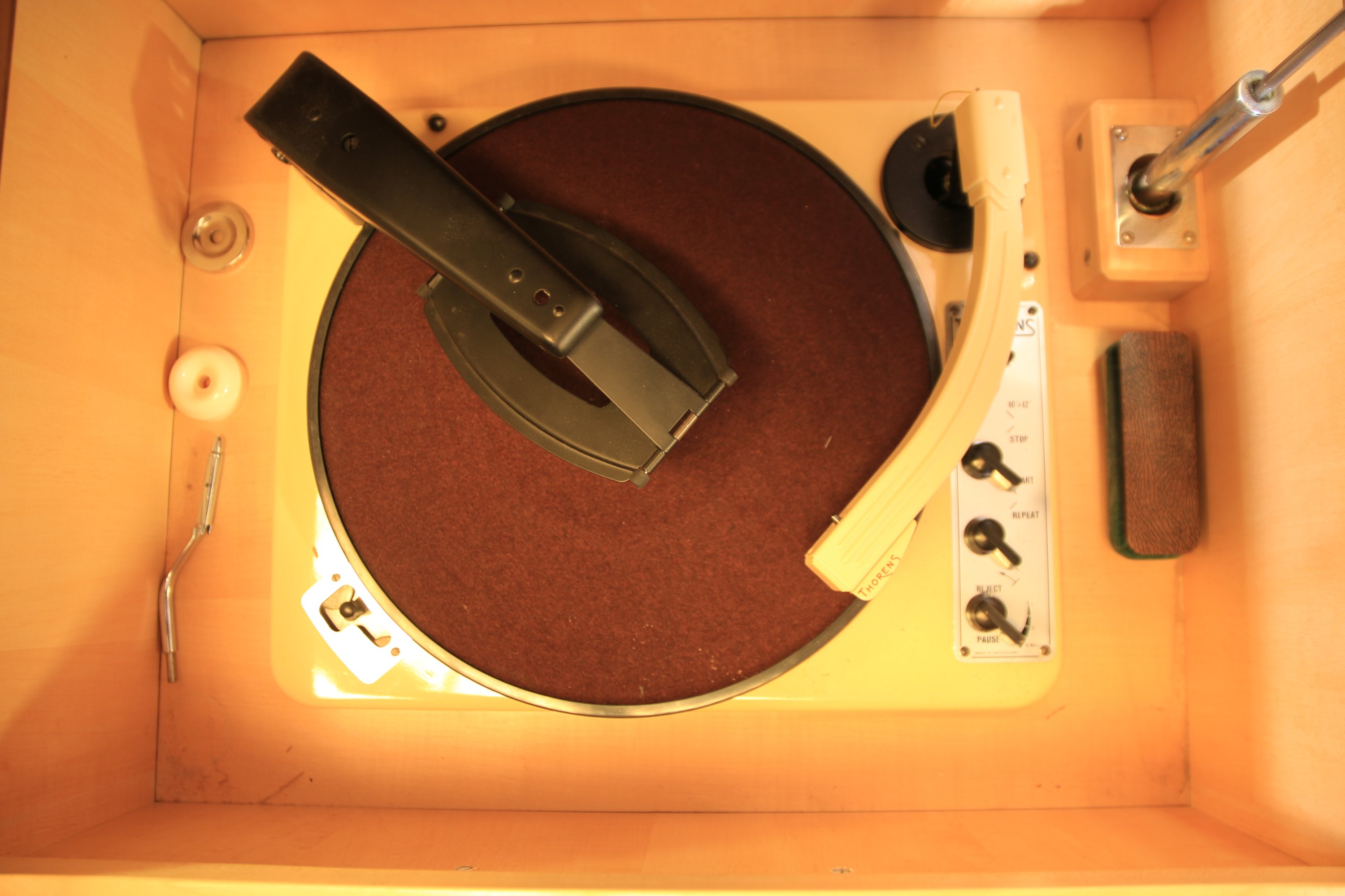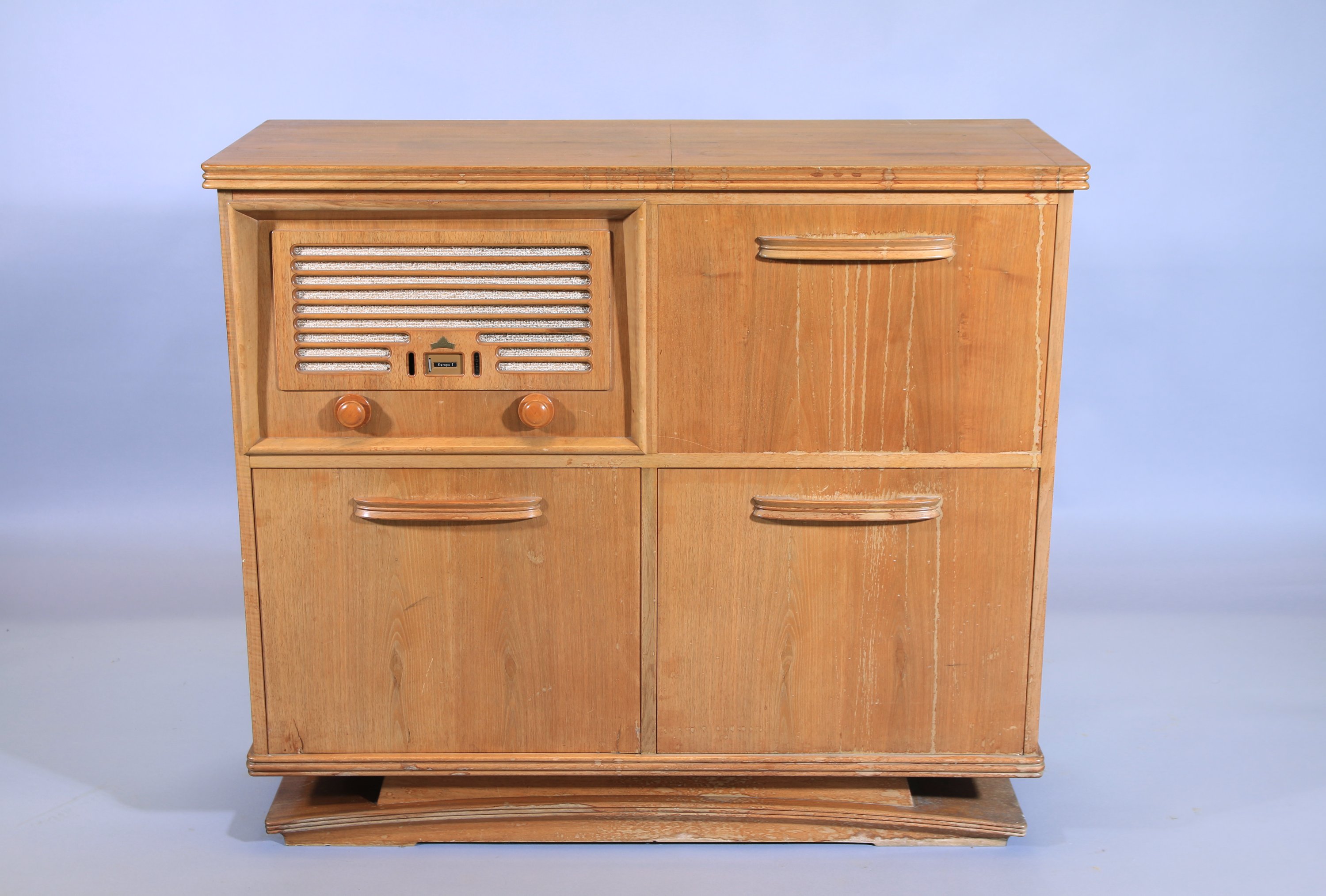en placage de chêne. La partie supérieure s'ouvrant par un abbatant dévoilant un tourne disque pour vinyls en 33, 45 et 78 tours. La radio intégrée dans le corps du meuble. Partie inférieure à deux abattants dévoilants deux niveaux à quatres étagères. Elle repose sur une plinthe.