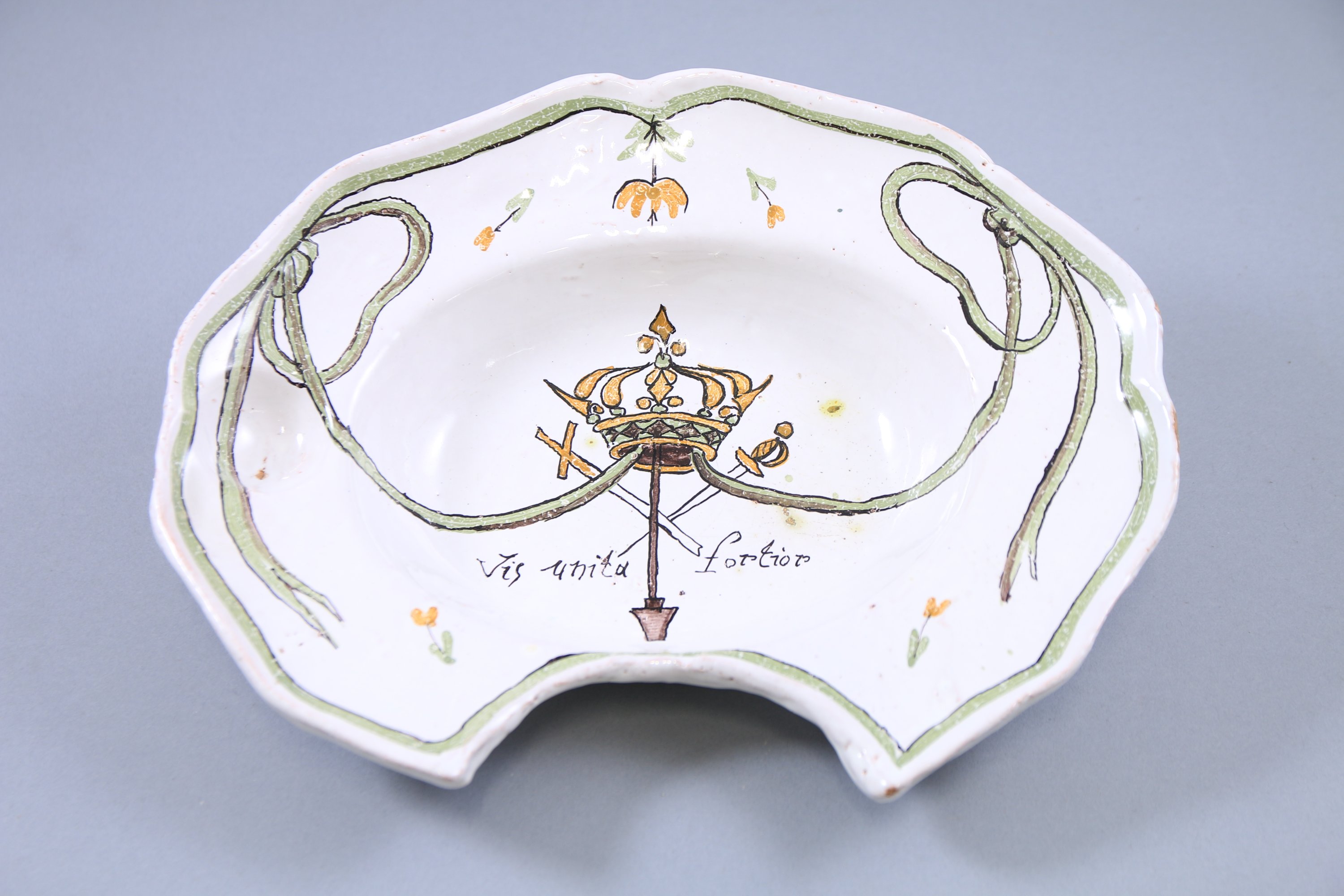 Faïence, décor central d'une couronne aux épée croisées dans un entourage enrubanné. Dans le creux la mention "Vis unita Fortior".