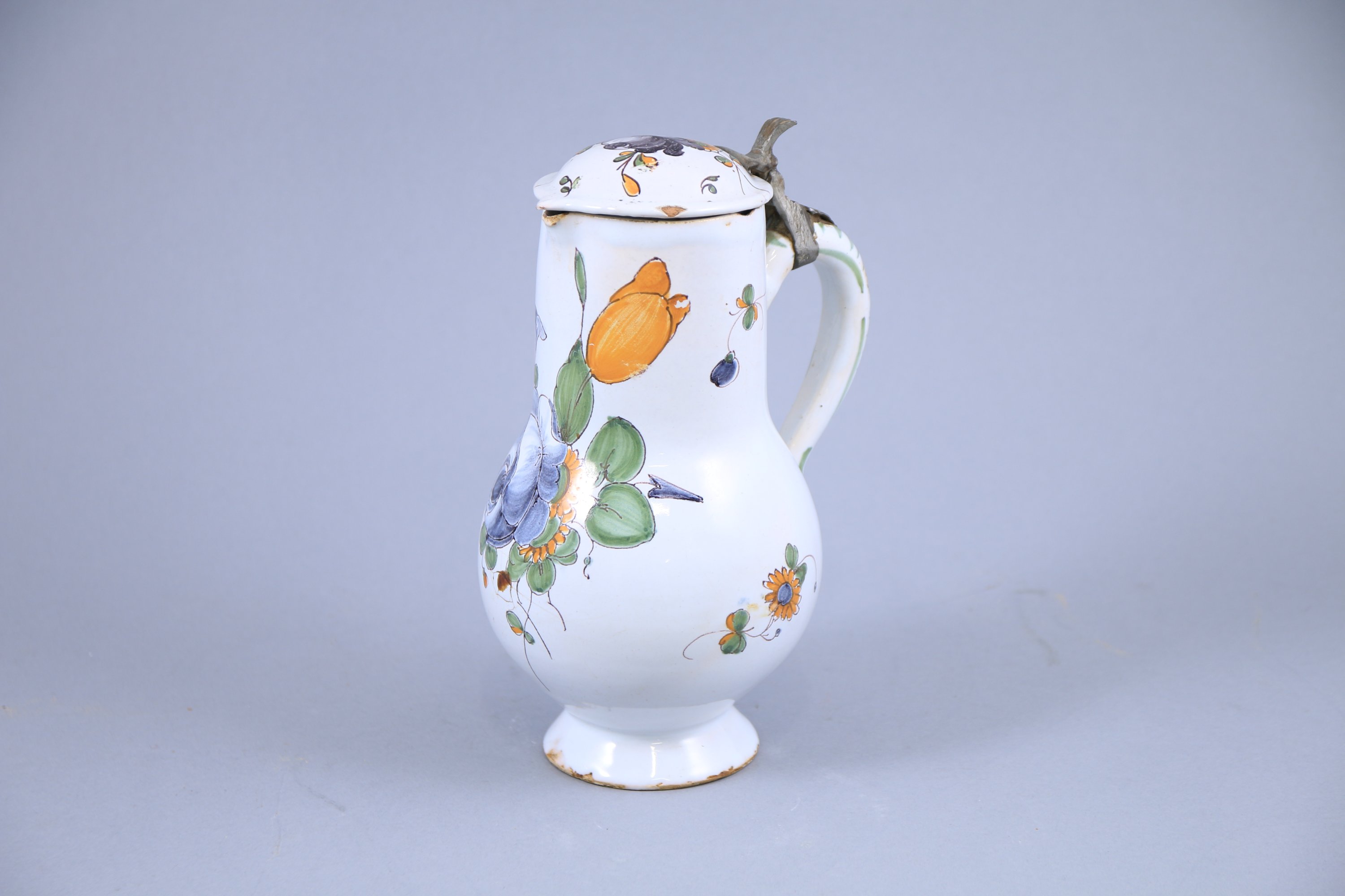 Joint : un pichet en faïence de Nevers du XVIIIe siècle à décor d'un bouquet de fleurs et d'un semis de fleurs sur fond blanc. Haut. 23,5 cm (accidents et fêles).