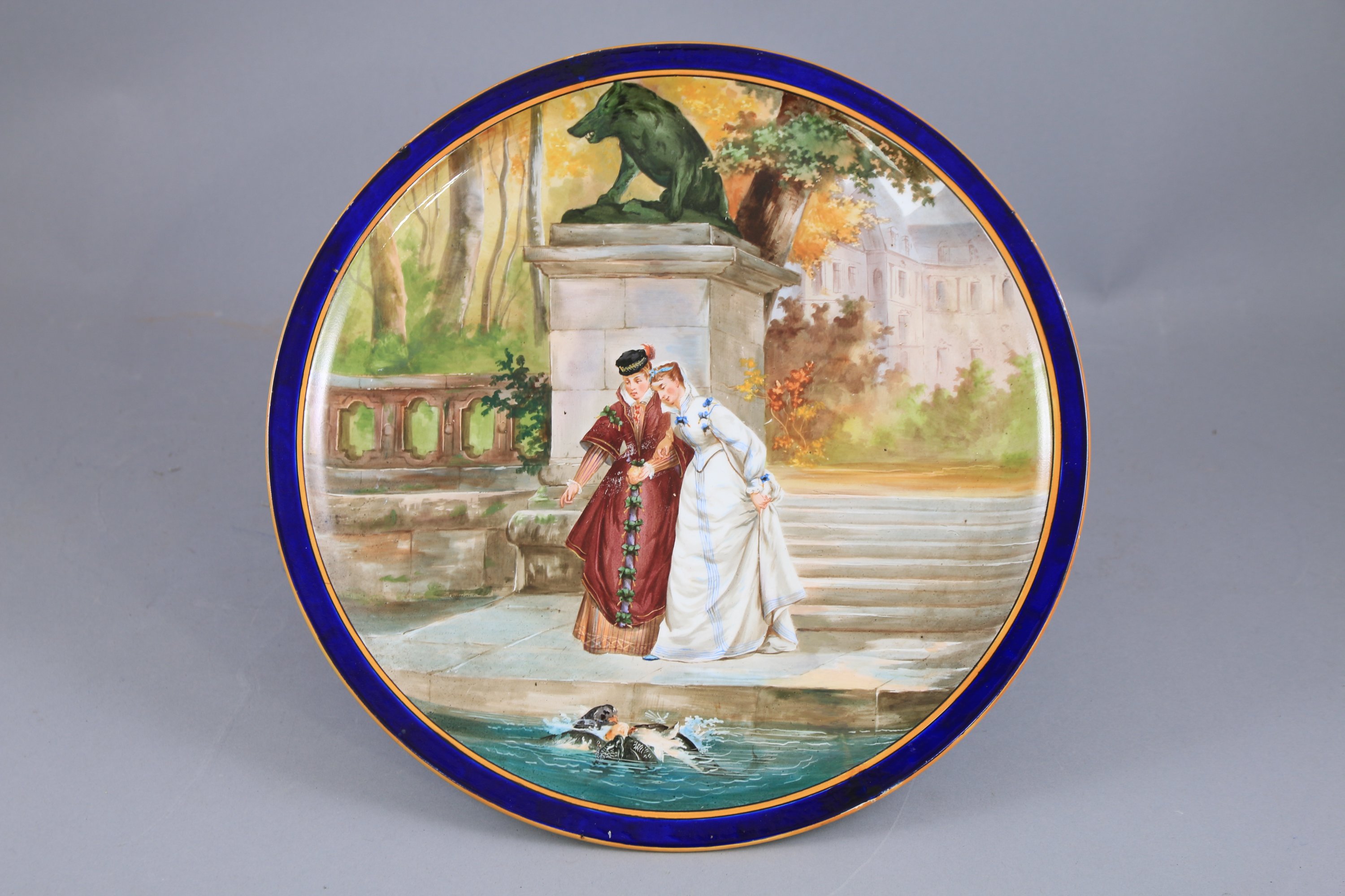 Faïence polychrome. A décor romantique d'un couple nourrissant les carpes dans le parc d'un château.