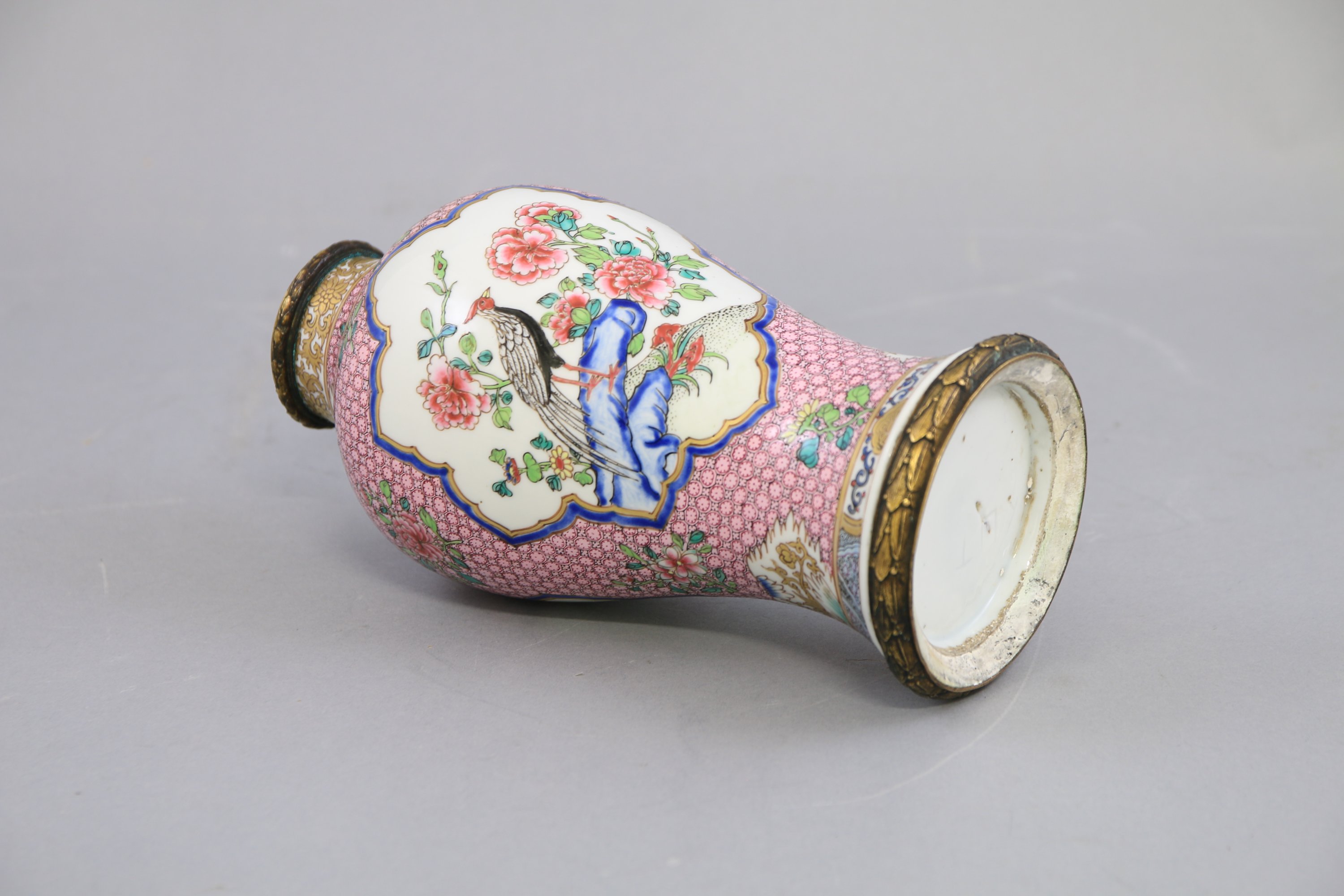 Porcelaine blanche à décor polychrome. Le décor de deux cartouches aux oiseaux dans un environnement de fleurs de pivoine, sur un fond rose.