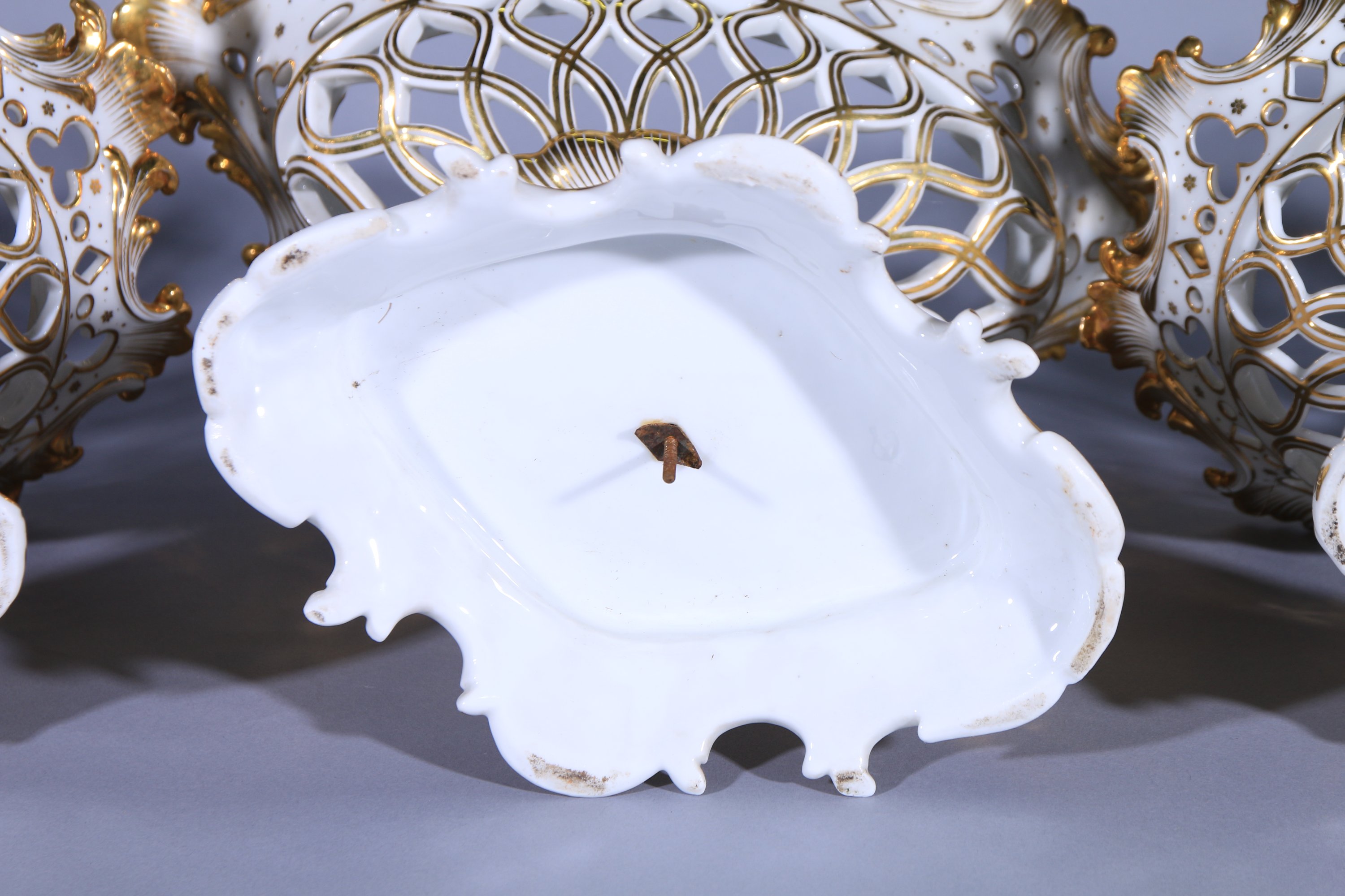 A décor ajouré blanc et rechampi doré, décor de bouquets de fleurs polychrome sur le pied. Une de forme navette, les autres circulaires.