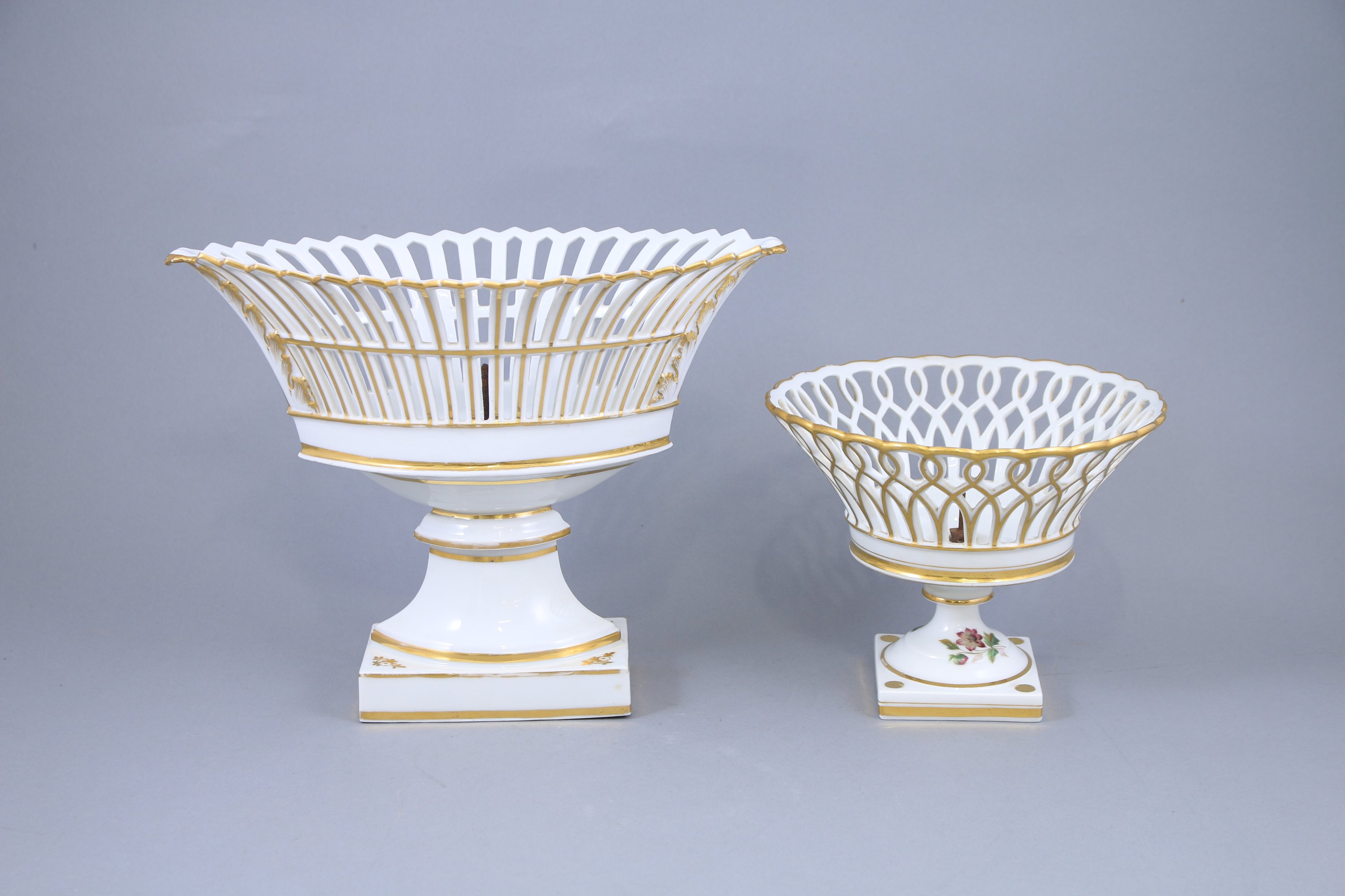 - deux corbeilles en porcelaine de Paris en porcelaine blanche ajourée, à décor d'acanthes et de rehauts dorés, l'une circulaire et l'autre de forme navette. Haut. 27 et 18,5 cm.