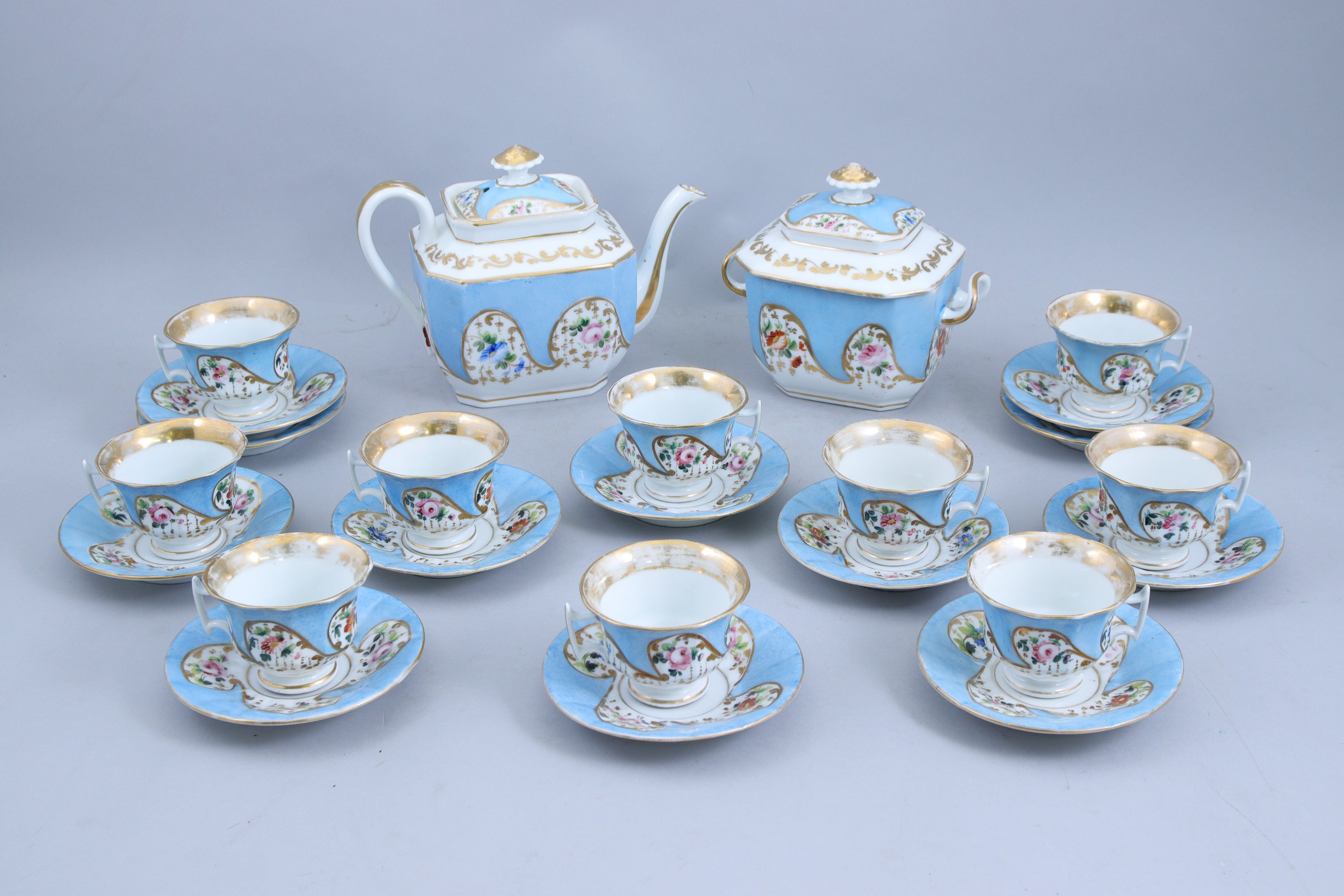 Porcelaine comprenant dix tasses, douze sous-tasses, une théière et un pot à sucre couvert à pans coupés, décorés de fleurs variées et de vagues bleu azur, rehaussés de liserés et de motifs d’or.