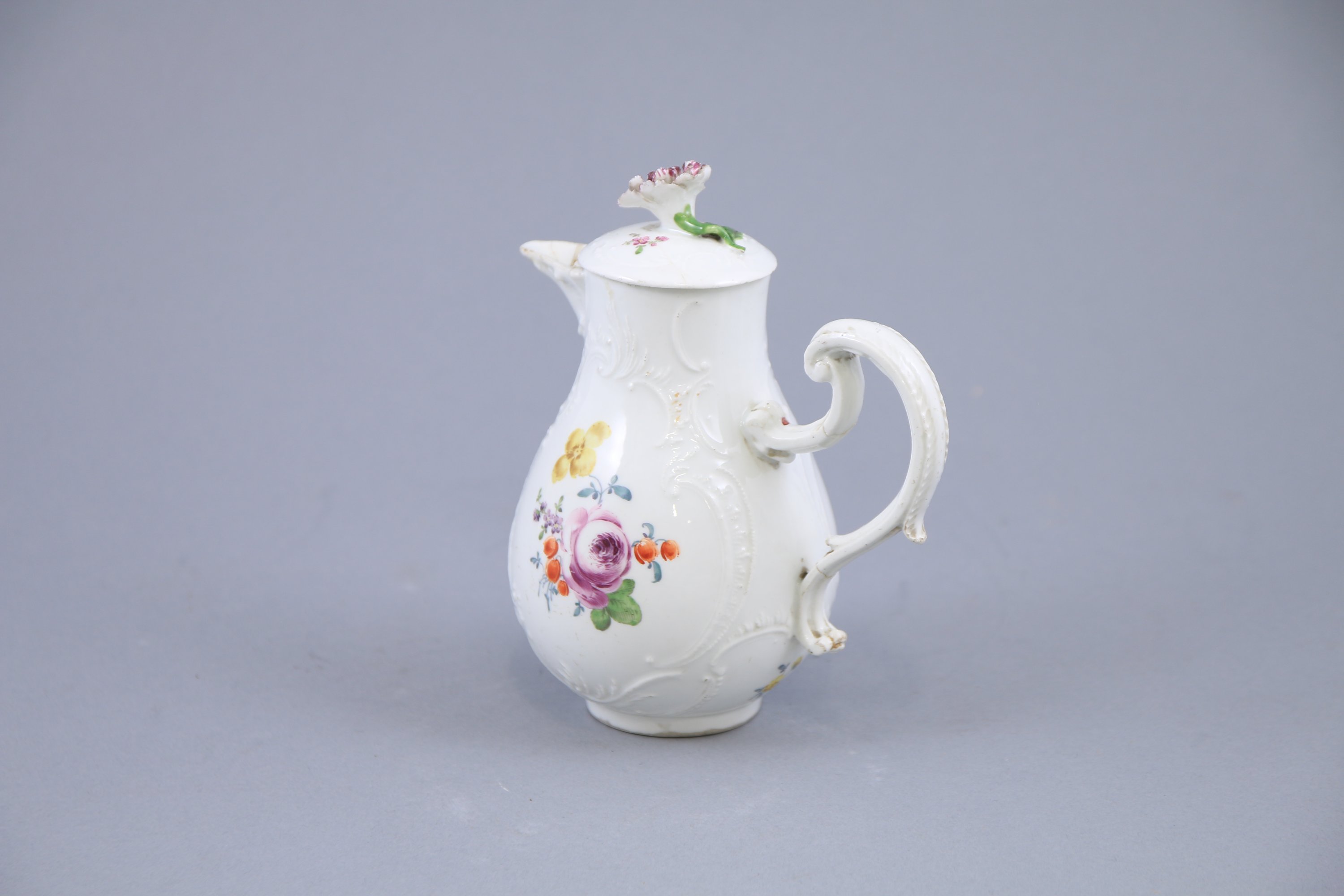 Joint : Verseuse égoïste en porcelaine blanche de Meissen à décor de fleurs polychromes et de rinceaux en méplat. Fin du XVIIIe siècle. Haut. 16,5 cm. (accidents, manques et restaurations)