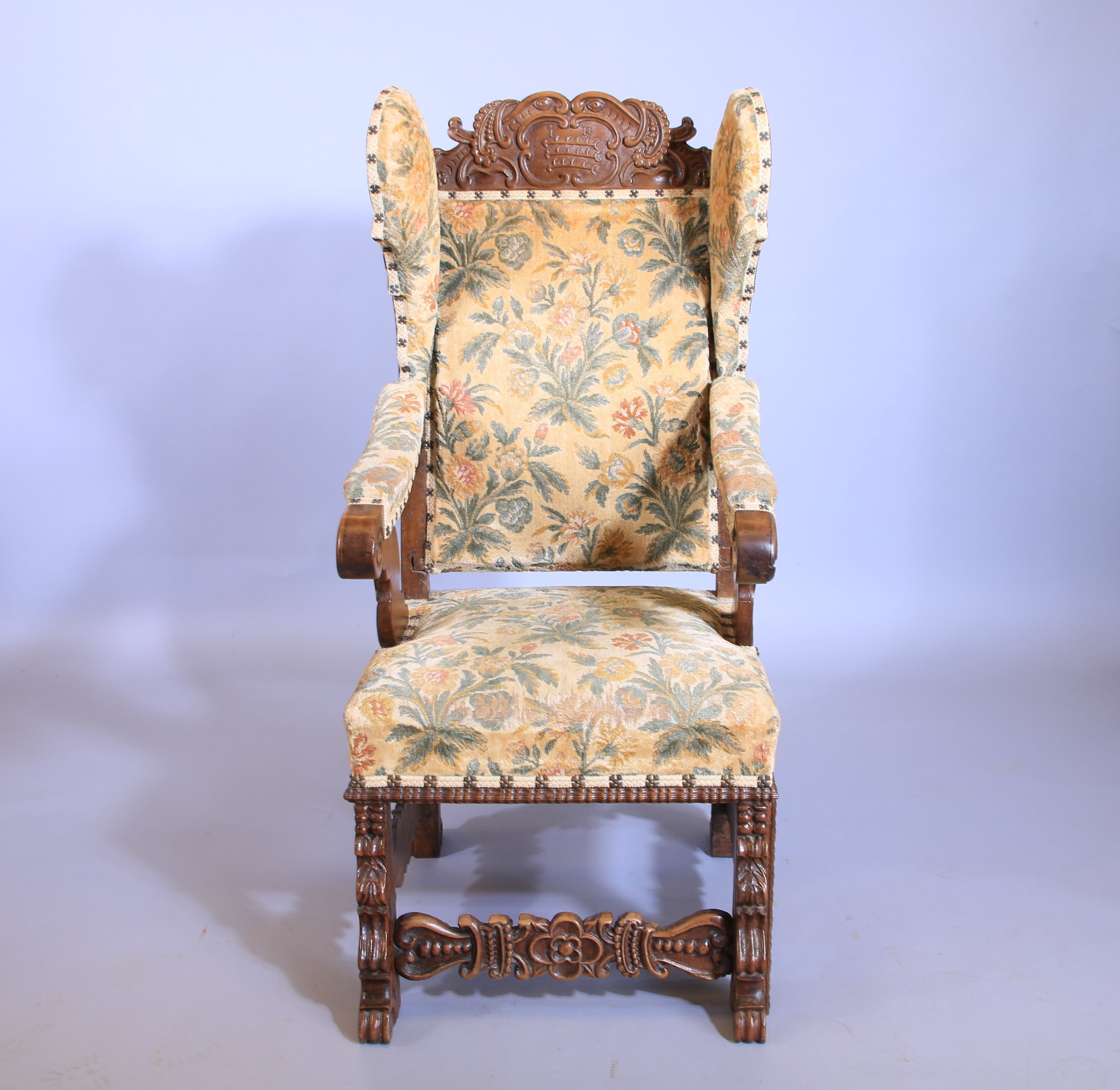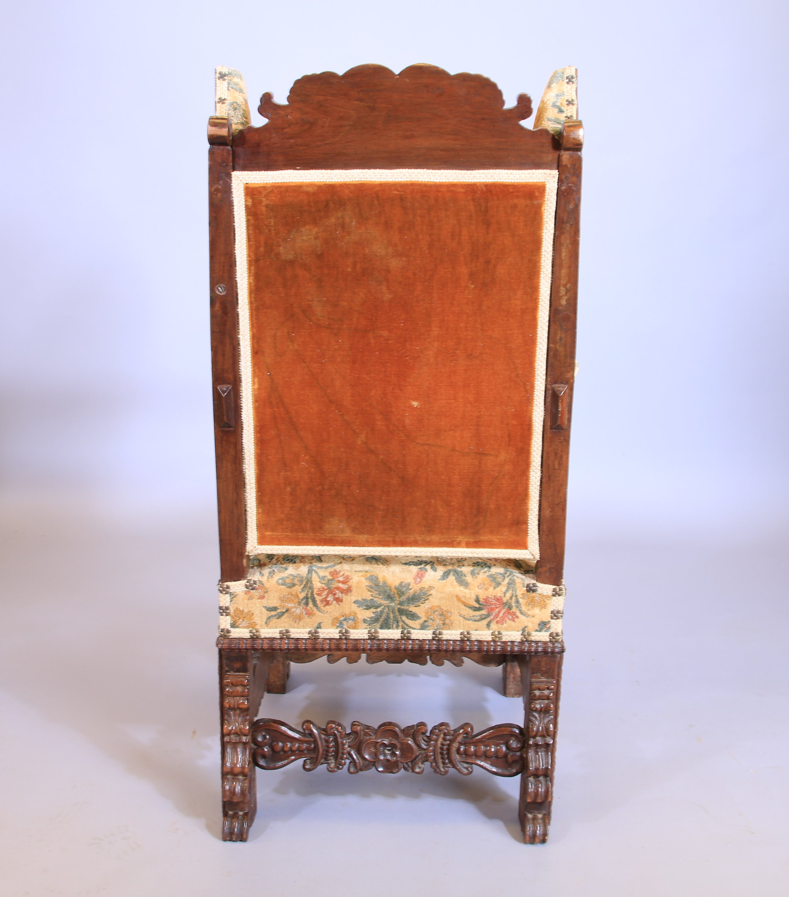 Sommet à décor d'une figure de chimère, accotoirs à manchettes terminés par des enroulements, pieds à décor de volutes, de végétaux et de perles, reliés par des barres d'entretoise richement décorés de volutes, frises de perles et fleurettes.