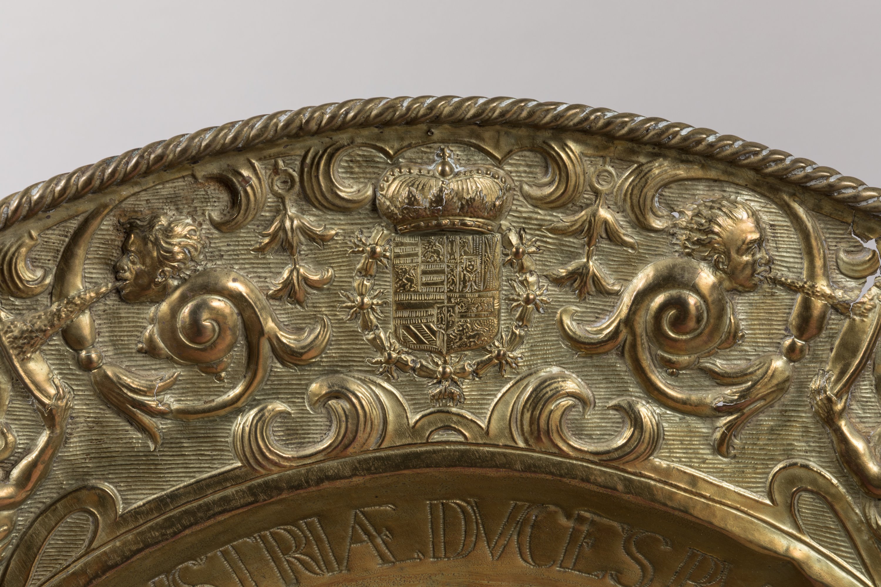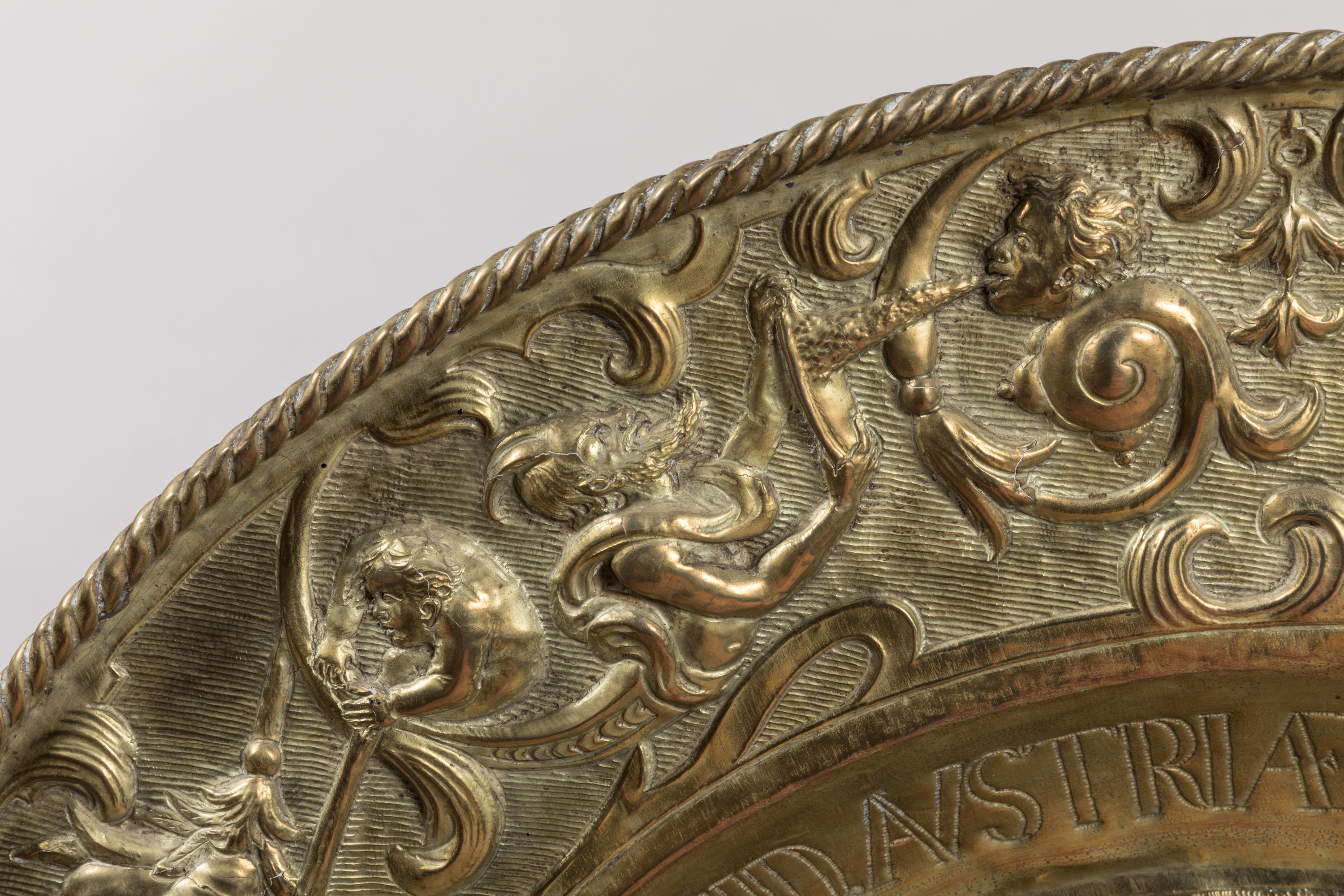 Laiton repoussé et ciselé, figurant le double portrait équestre d'Albert et Isabelle de Brabant devant le siège d'Ostende. Légendé "Albertus et Isabella D.C. Archid. Austriae. Duces Burgun. Brabant Com. Flandriae".