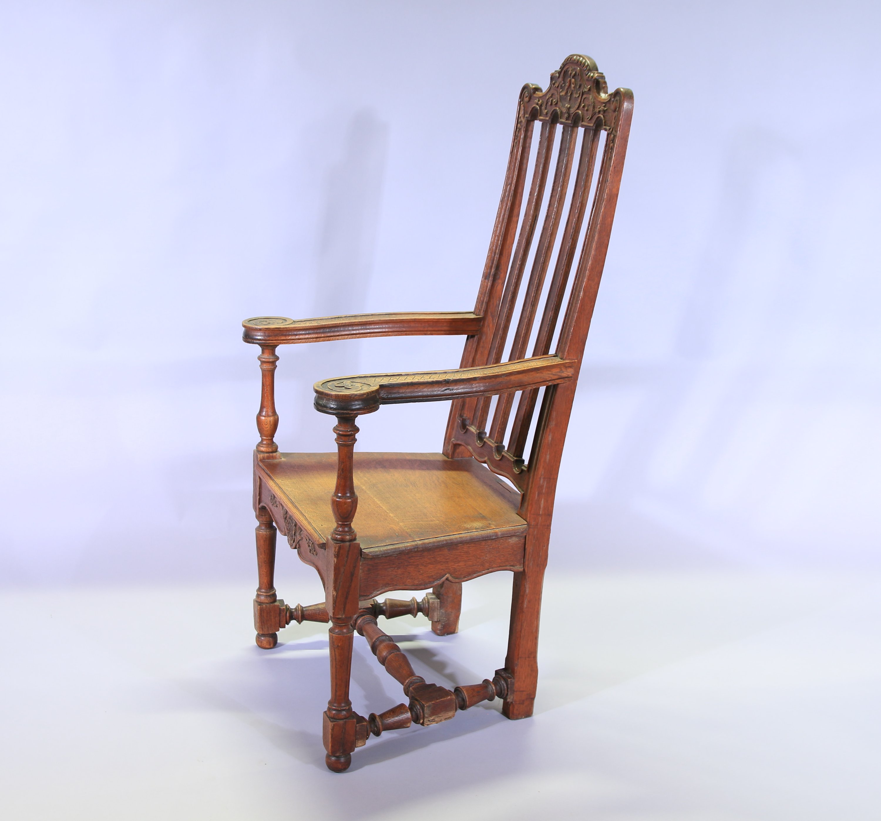Chêne mouluré et sculpté, le dossier ajouré est décoré de frises et de motifs végétaux. Les accotoirs renversés finissent en volutes décorées en leur centre de fleurs. Assise trapezoïdale ornée en ceinture de motifs végétaux et floraux. L'ensemble repose sur deux pieds antérieurs de forme balustre et deux pieds arrières droits rejoints par une entretoise.