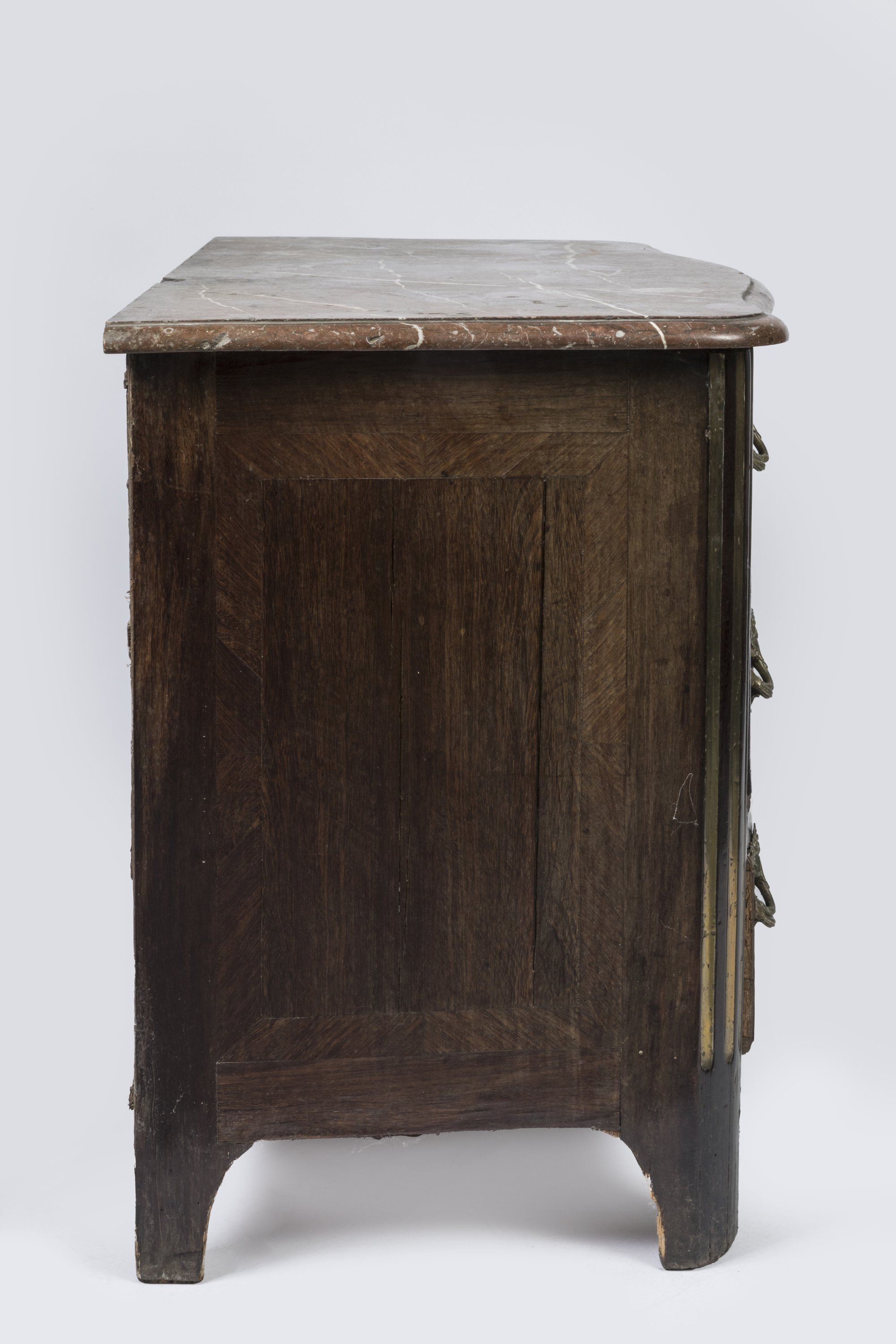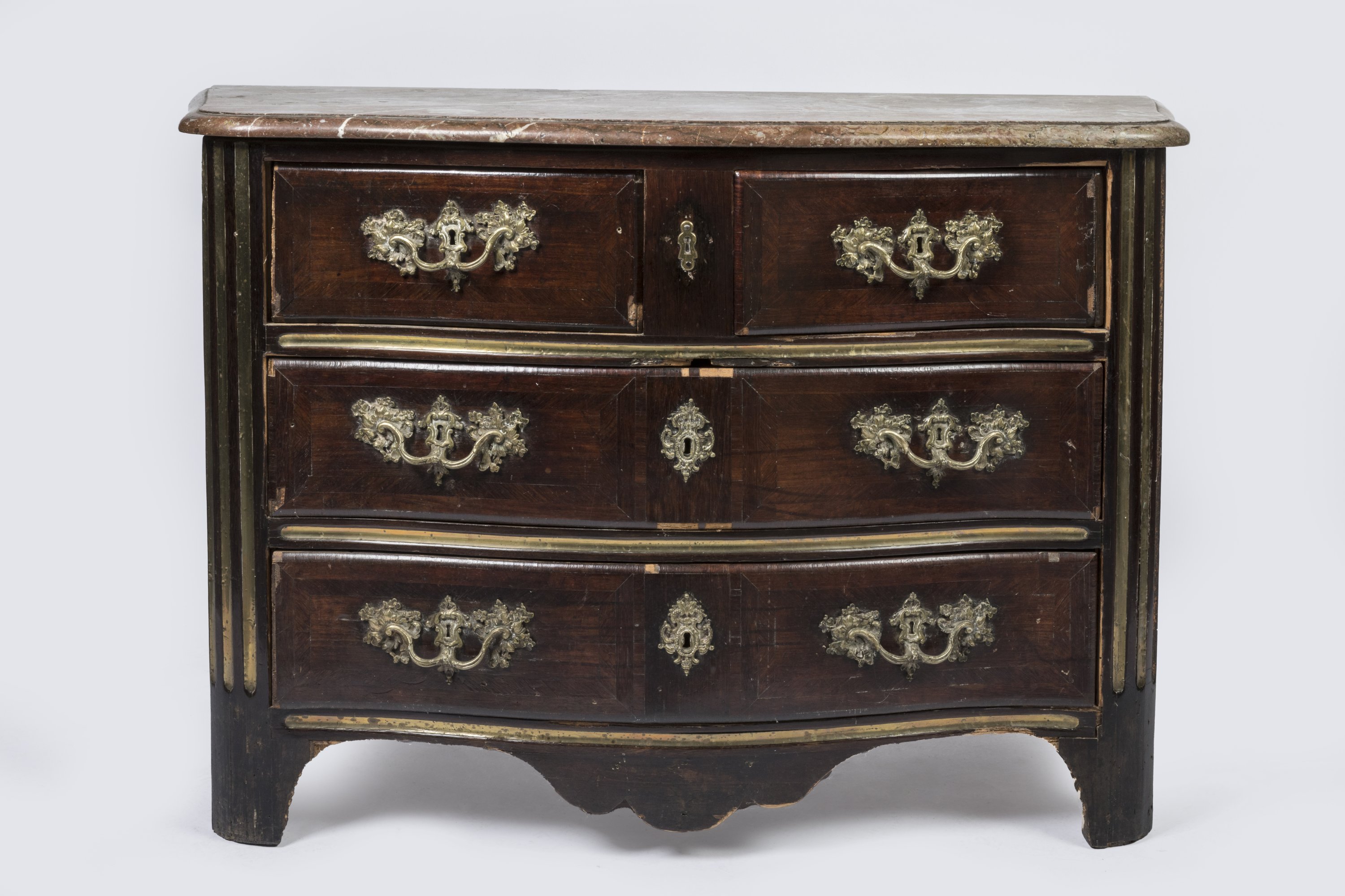 Elle ouvre par quatre tiroirs sur trois rangs séparés par des cannelures de laiton. Chacun est décoré de losanges et d'encadrements soulignés de filets en chevrons.