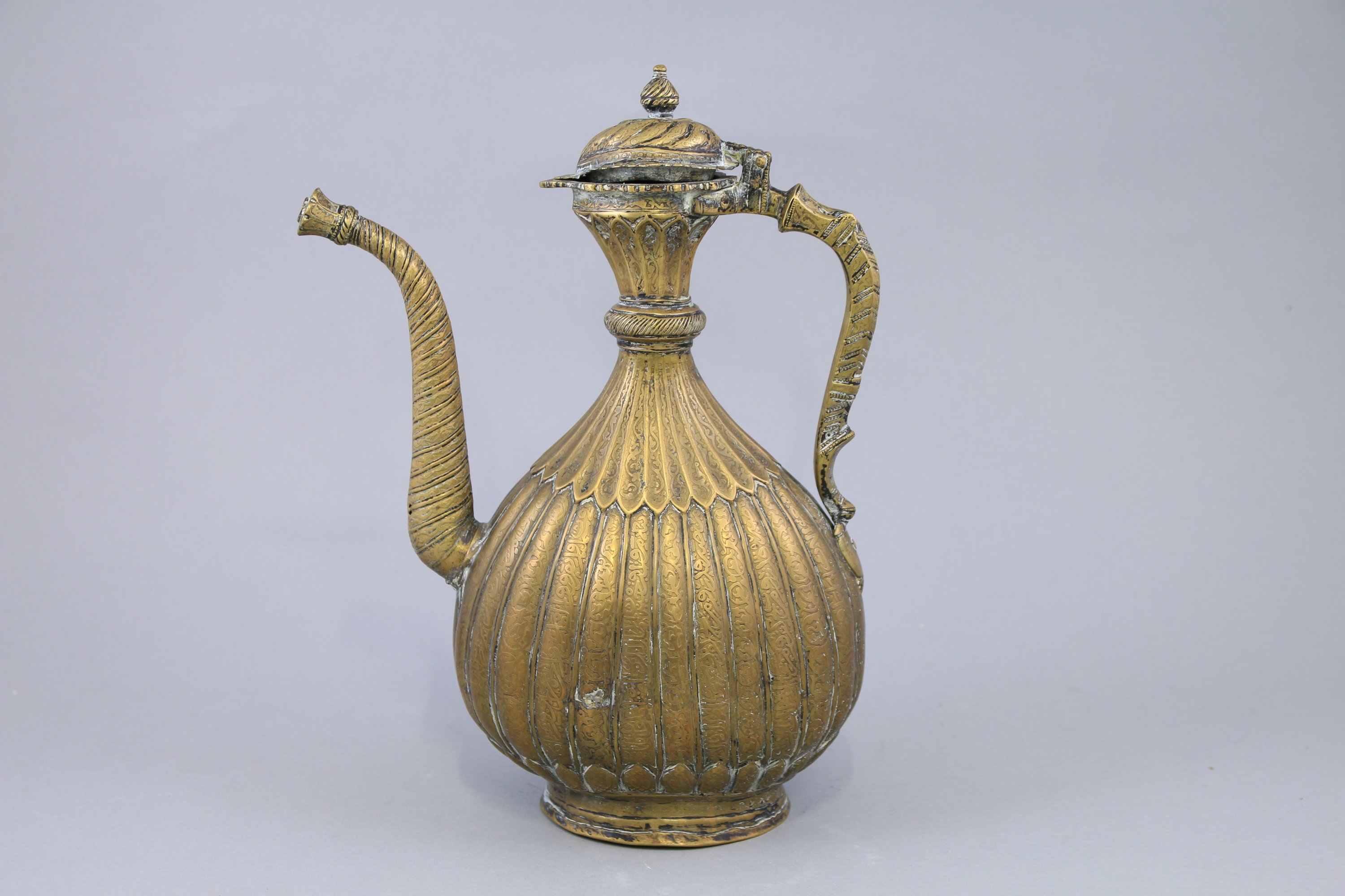 A décor de godrons rehaussés de calligraphies et de rinceaux, bec et anse torsadés, le fretel en forme de coupole bulbeuse.