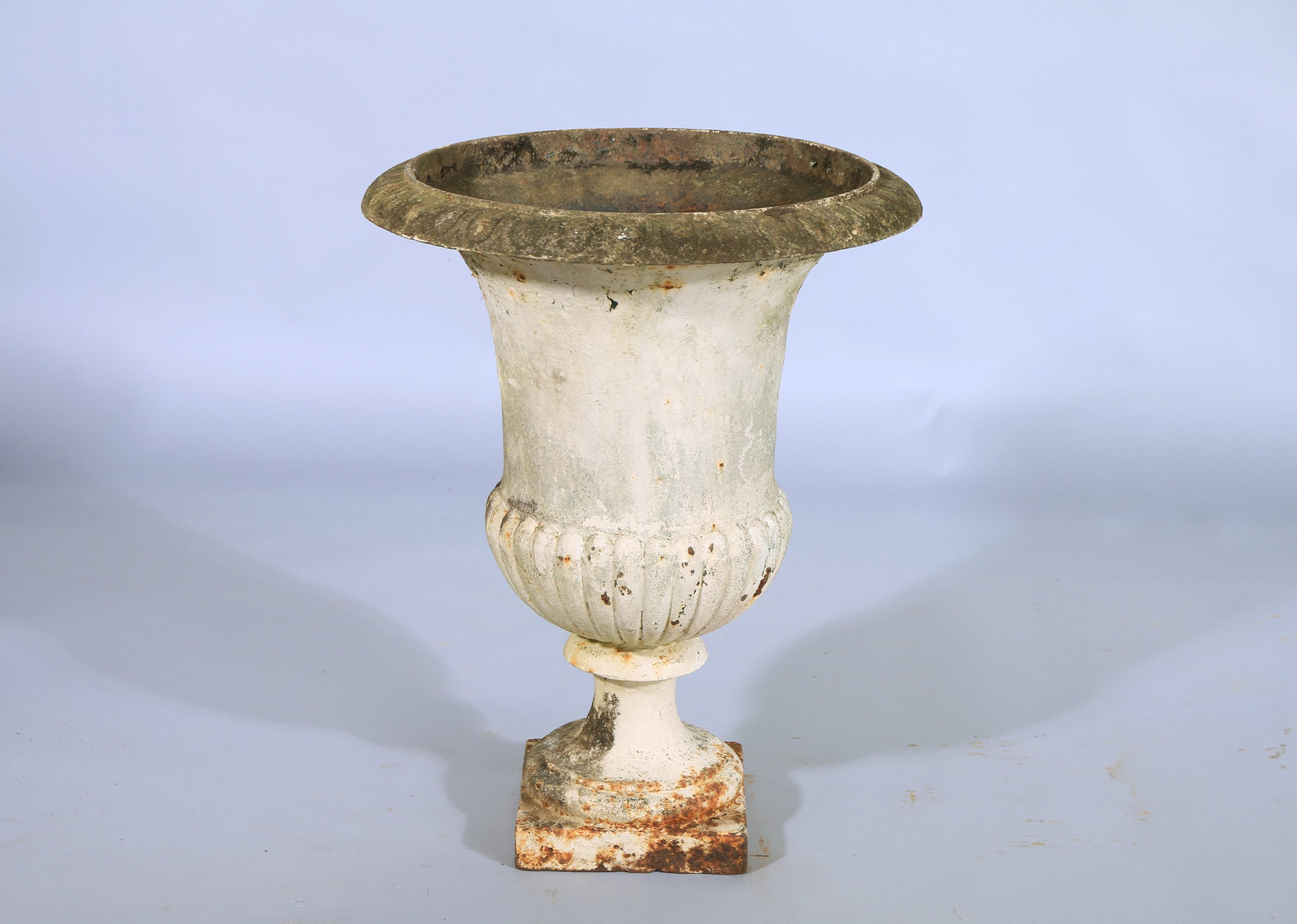 Joint : vase médicis en fonte laquée blanche, lèvre à décor d'une frise d'oves et panses à décor de godrons. Il repose sur un piédouche fixé sur une base carrée. Haut. 65 Larg . 50 cm. (oxydations et piqûres)