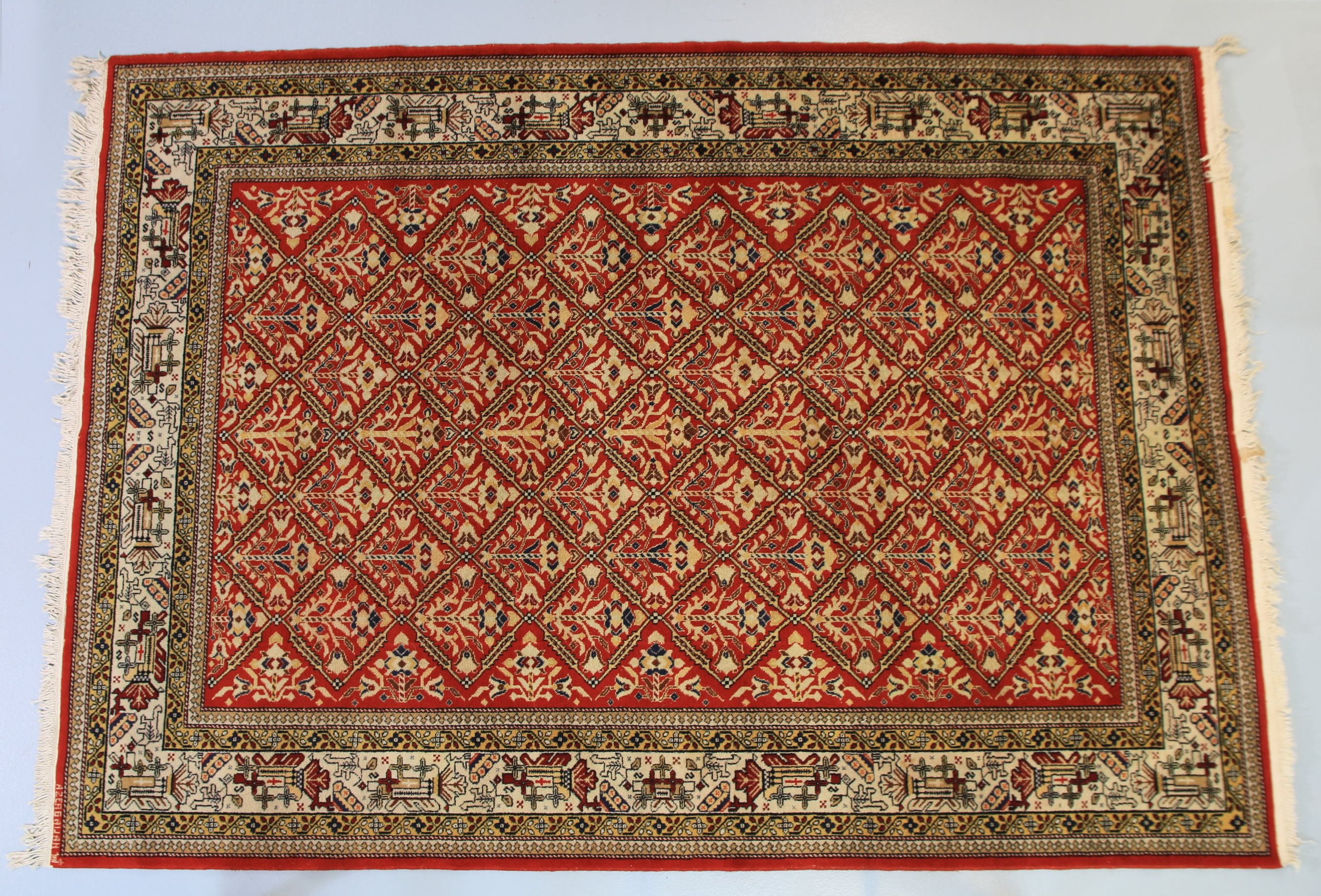Décor de fleurs dans un réseau losangé, bordure crème de fleurs entre des galons jaunes.