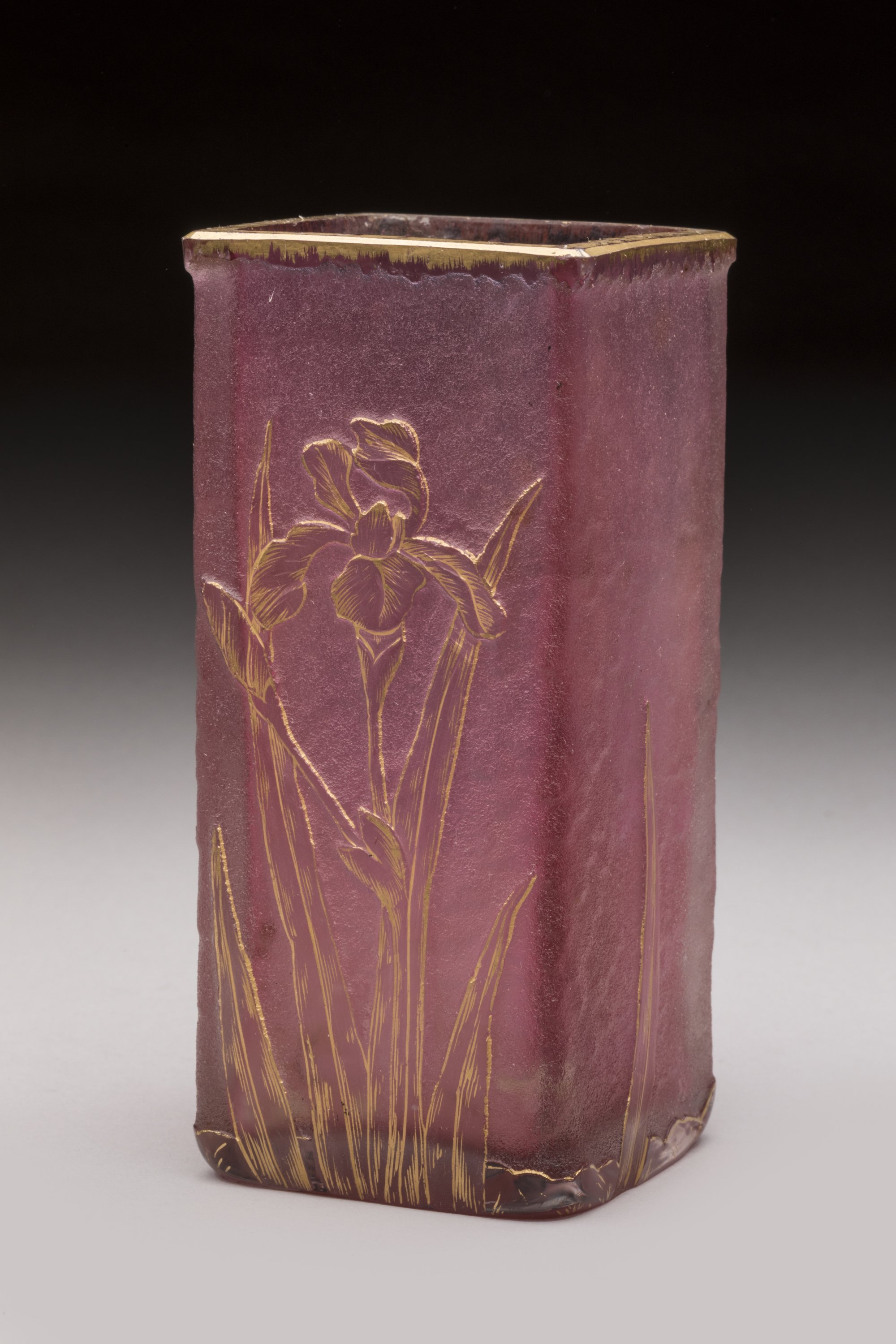 Verre grivé rose de section carrée au décor dégagé à l'acide et gravé à la roue d'iris.