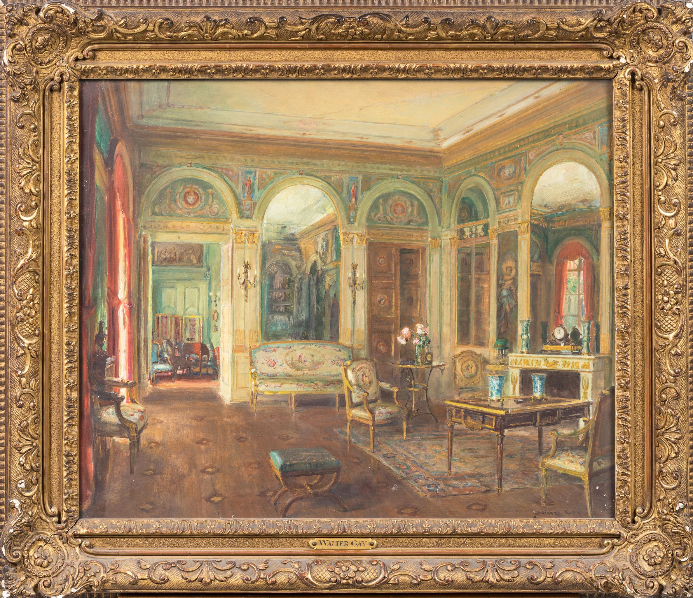 Peintre et collectionneur d’art Américain, Walter Gay arrive en France dès 1876. Il peint sa première scène d’intérieur dès 1895 avec une vue de sa maison de campagne à Magnanville dans laquelle il insuffle une lumière particulière rappelant le travail de Turner. Il représente ainsi de nombreux intérieurs de châteaux ou d’hôtel particuliers tels que ceux du musée Carnavalet, du château de Versailles ou de son propre château de Bréau. Il en réalise aussi chez ses amis comme le couple Jacquemart-André dont il reproduit le grand salon dans une œuvre aujourd’hui conservée au Metropolitan Museum of Art (n°61.91) ou le salon de Lord Stafford. Ce thème lui permet d’organiser sa première exposition personnelle dès 1905 à la Galerie George Petit qui connait un franc succès.