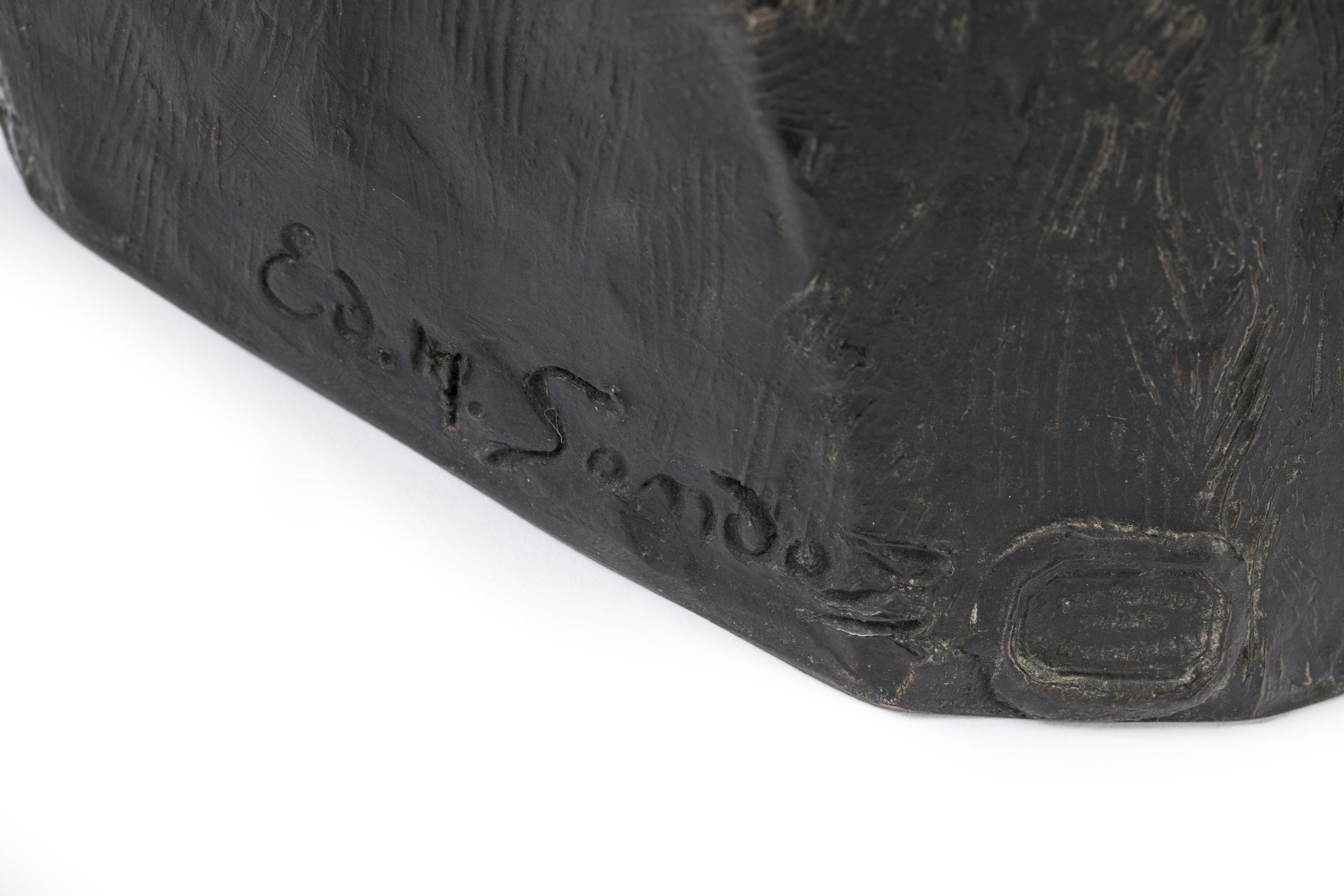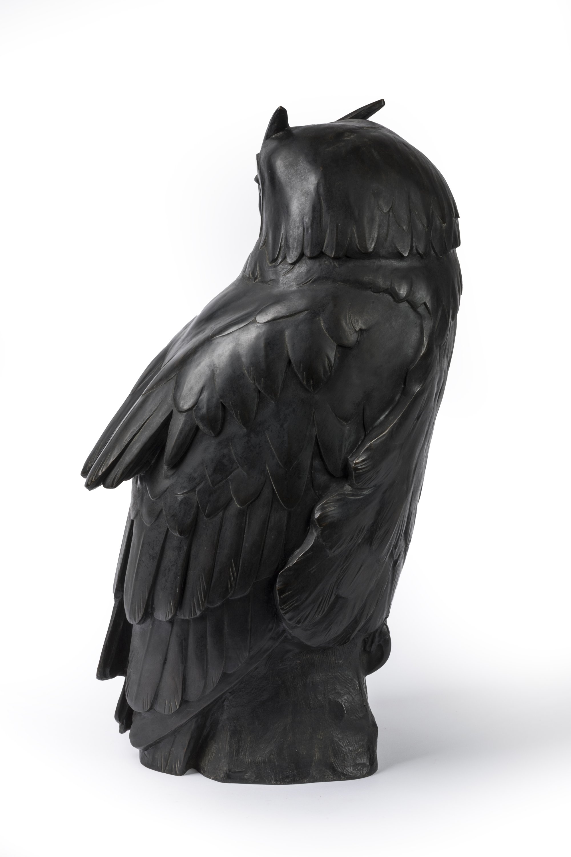 Le grand-duc est l’animal fétiche d’Edouard Marcel Sandoz, qui réalise son premier portrait d’animal en 1908, alors qu’il attrape un petit hibou lors d’un voyage en Sicile. Le rapace nocturne devient le sujet le plus représenté dans le corpus du sculpteur. Contrairement à d’autres artistes animaliers, hantant les zoos à la recherche de bêtes sauvages en captivité, Sandoz puise, lui, son répertoire dans l’observation d’animaux indigènes et pacifiques, dont il souligne la bizarrerie de la silhouette, la cocasserie de l’allure où, comme ici, la gravité de l’attitude.