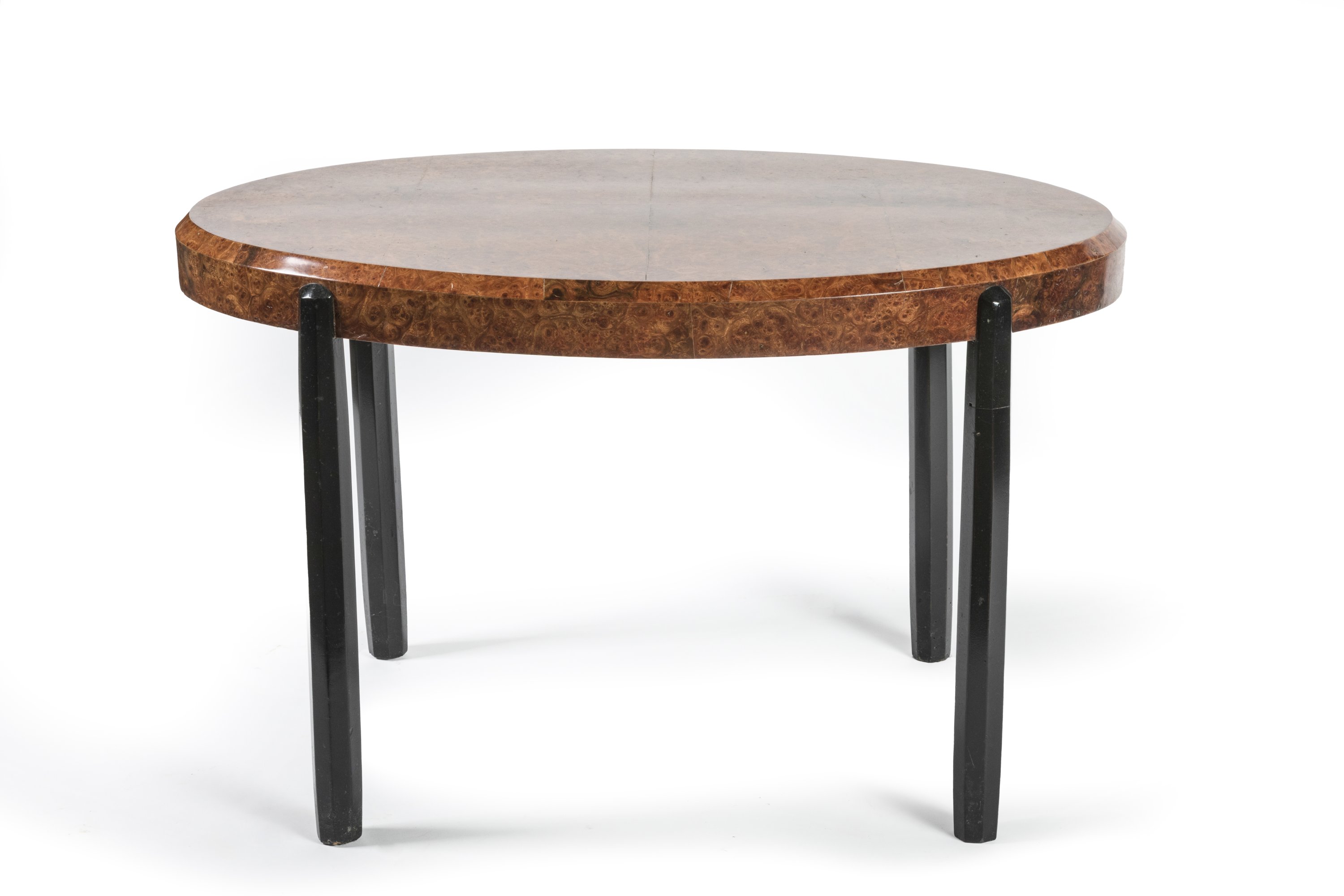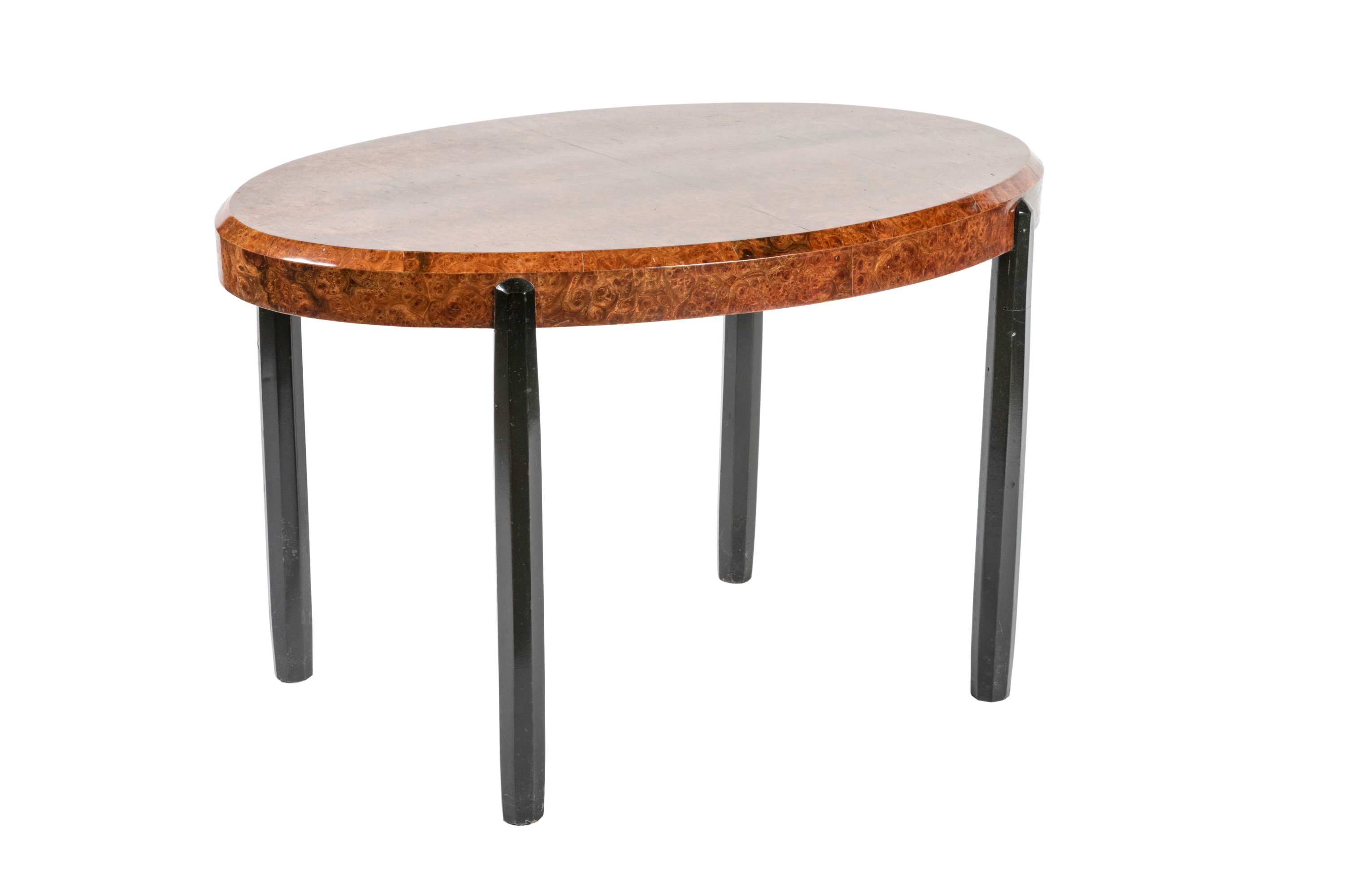 Le plateau de forme ovale reposant sur quatre pieds octogonaux en bois laqué noir.