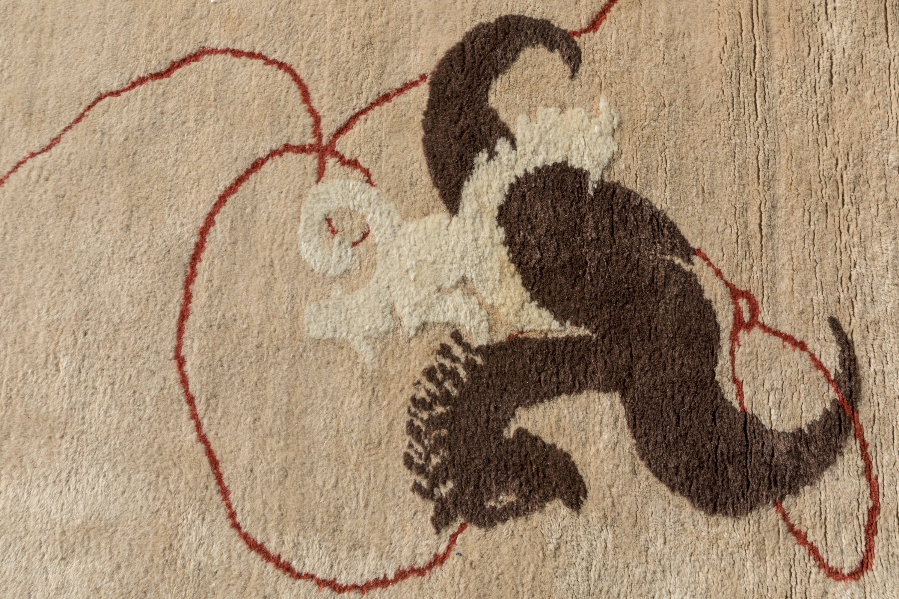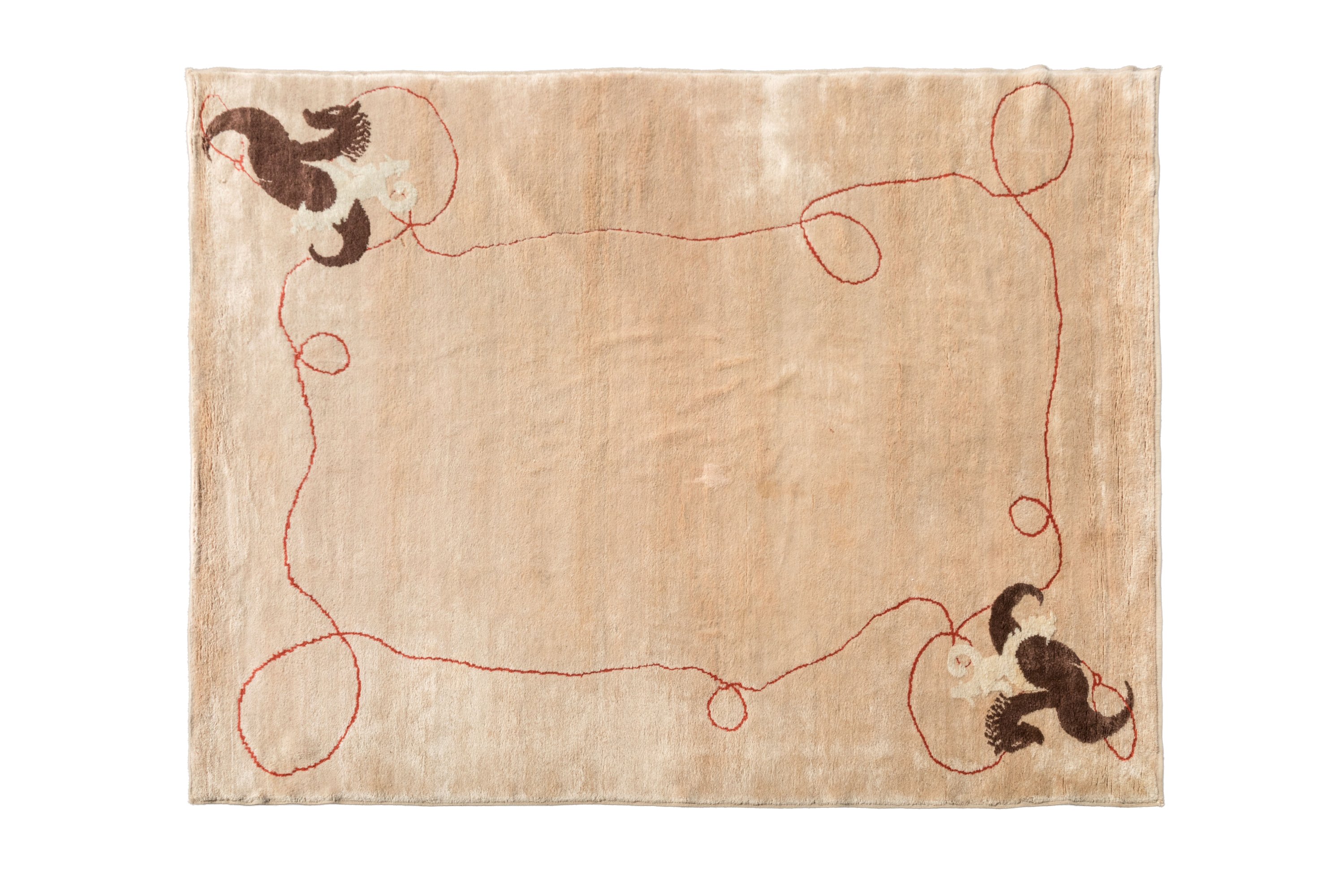 Fond crème, décor rouge d’un ruban ondulant, cavaliers à deux écoinçons.