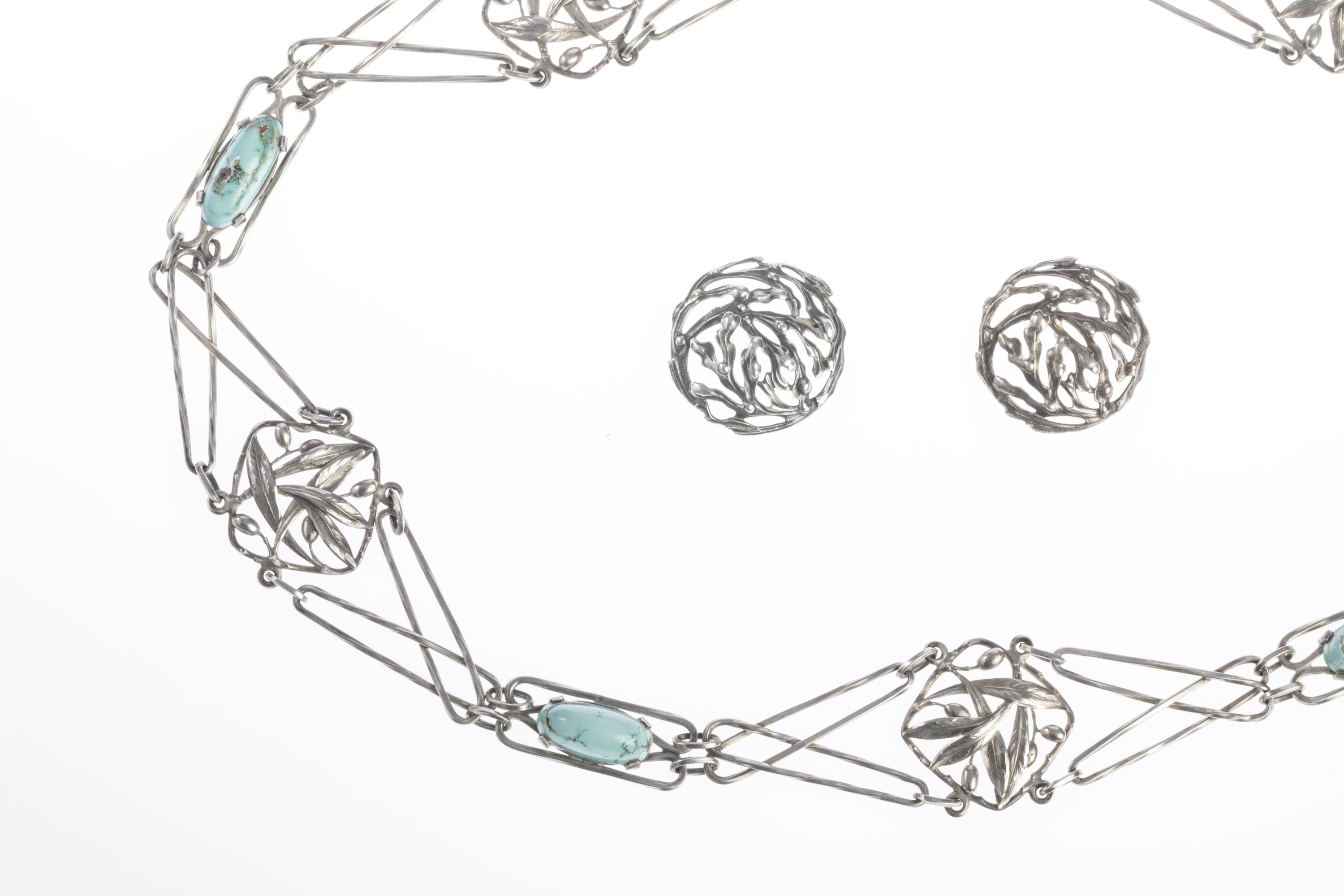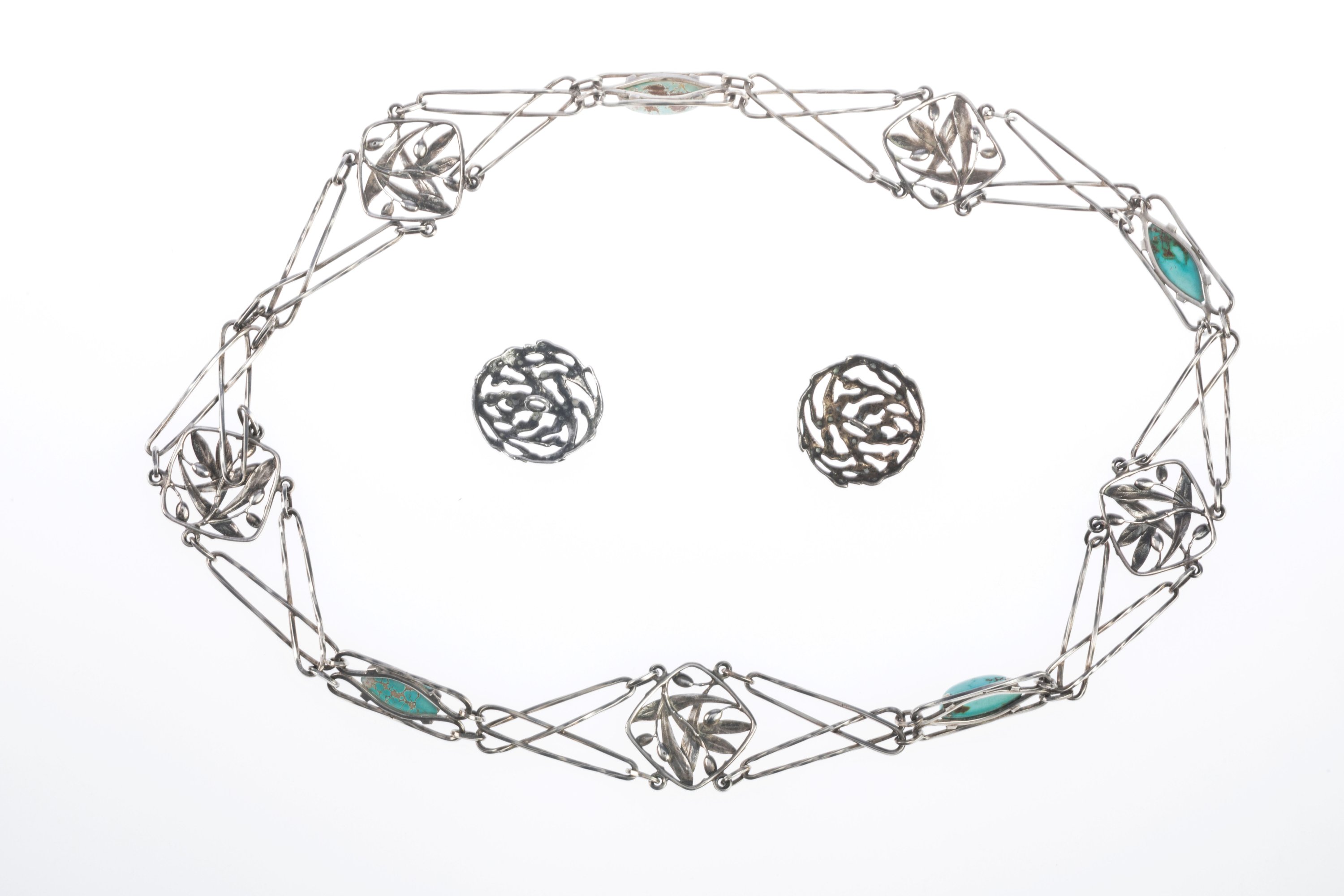 Le collier à cabochons de turquoise à double maille retenant cinq médaillons aux branches d'olivier stylisées. Poinçons tête de sanglier. Long. 85,5 cm. Poids brut 160 g.
