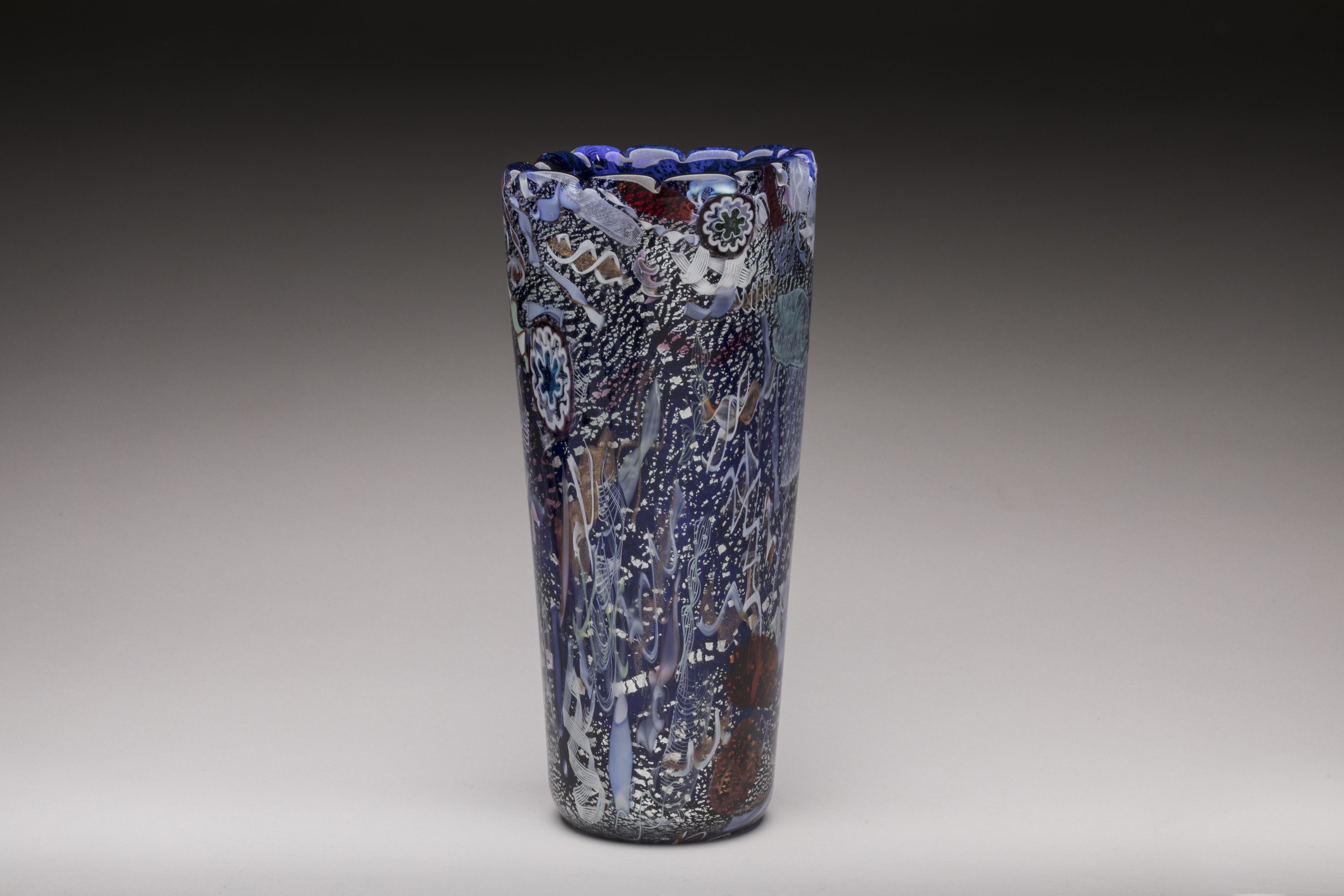 Le vase droit au col relevé à fond bleu paillé d'argent.