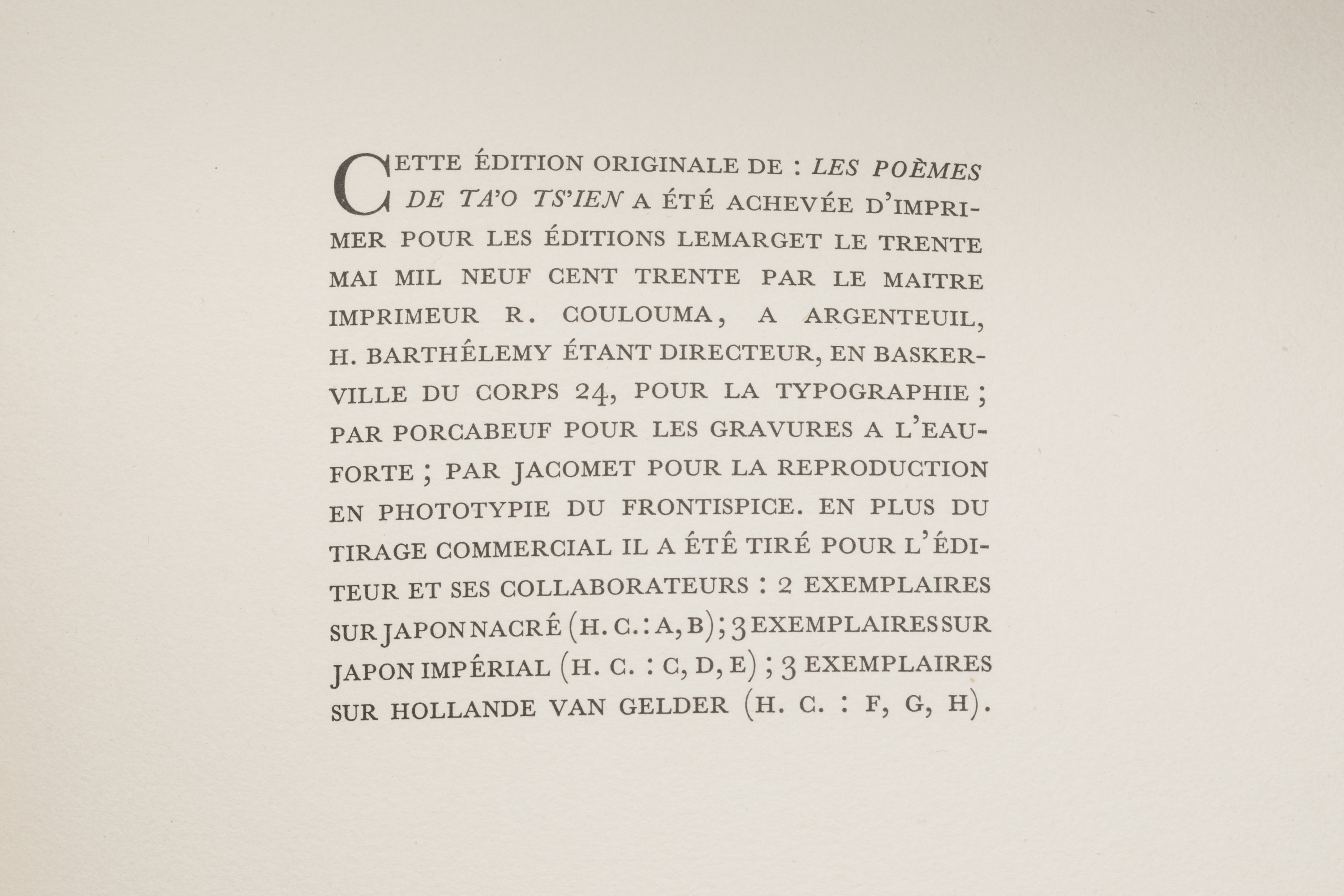 Le seul ouvrage illustré par Sanyu, comprenant trois eaux-fortes originales hors-texte et un portrait du poète d'après Hwang Shen (1687-1772). Traduit du chinois par Liang Tsong Tai avec la préface de Paul Valéry.
