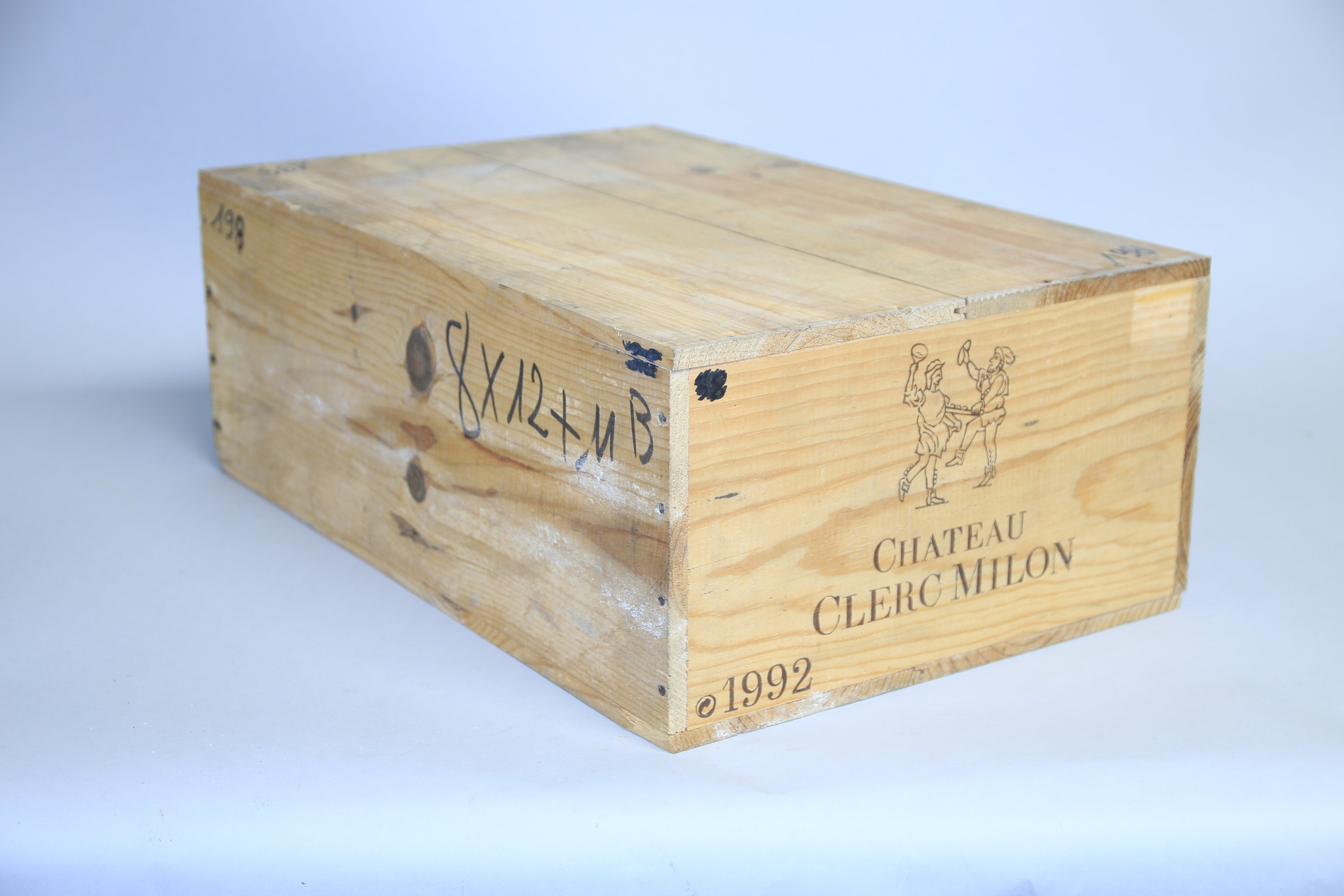 Pauillac, Château Clerc Milon, 5ème Grand Cru classé, 1992, 12 bouteilles. Caisse en bois d'origine (numérotation au feutre).