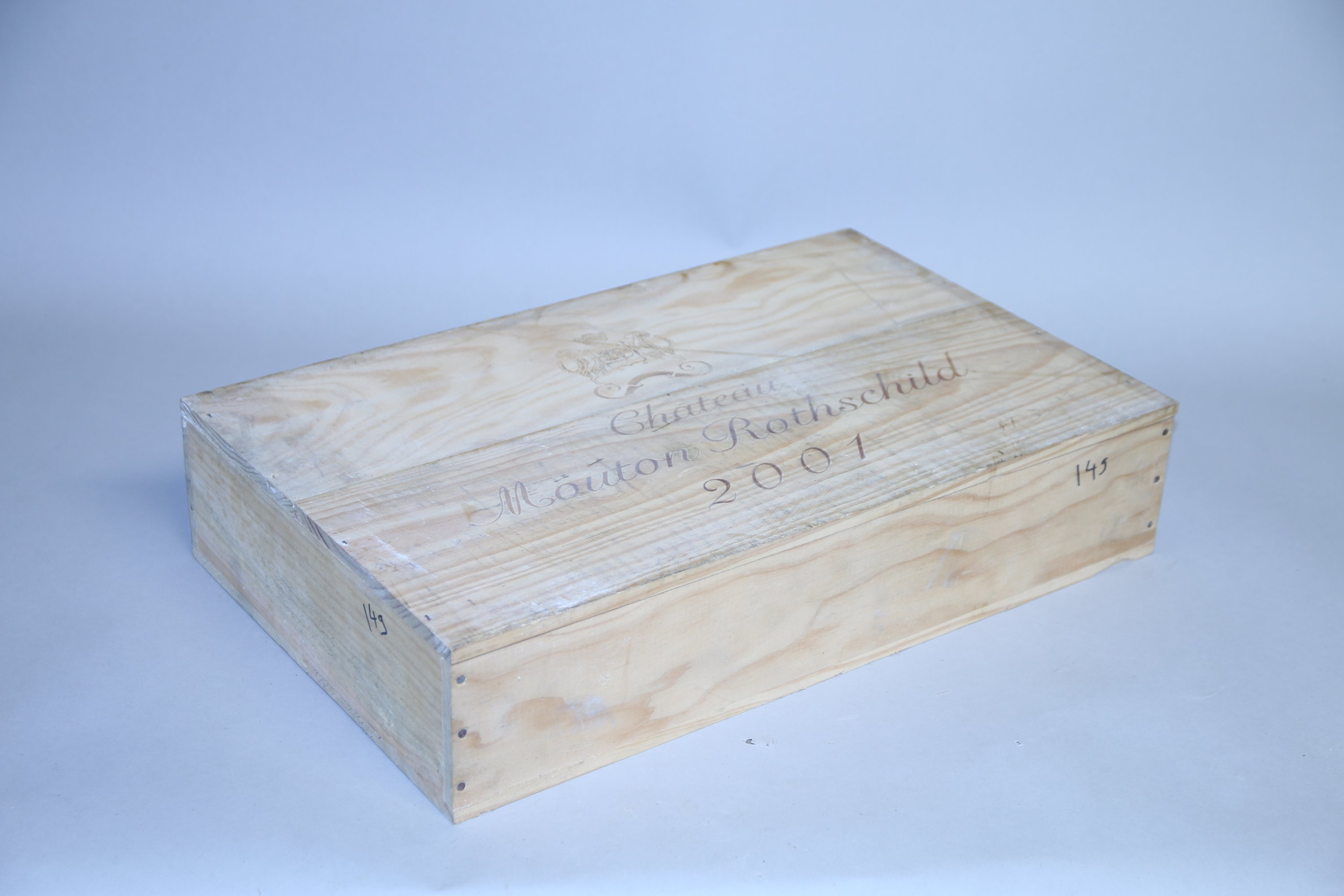 Pauillac, Château Mouton Rothschild, 1er Grand Cru classé, 2001, 6 bouteilles. Caisse en bois d'origine (numérotation au feutre).