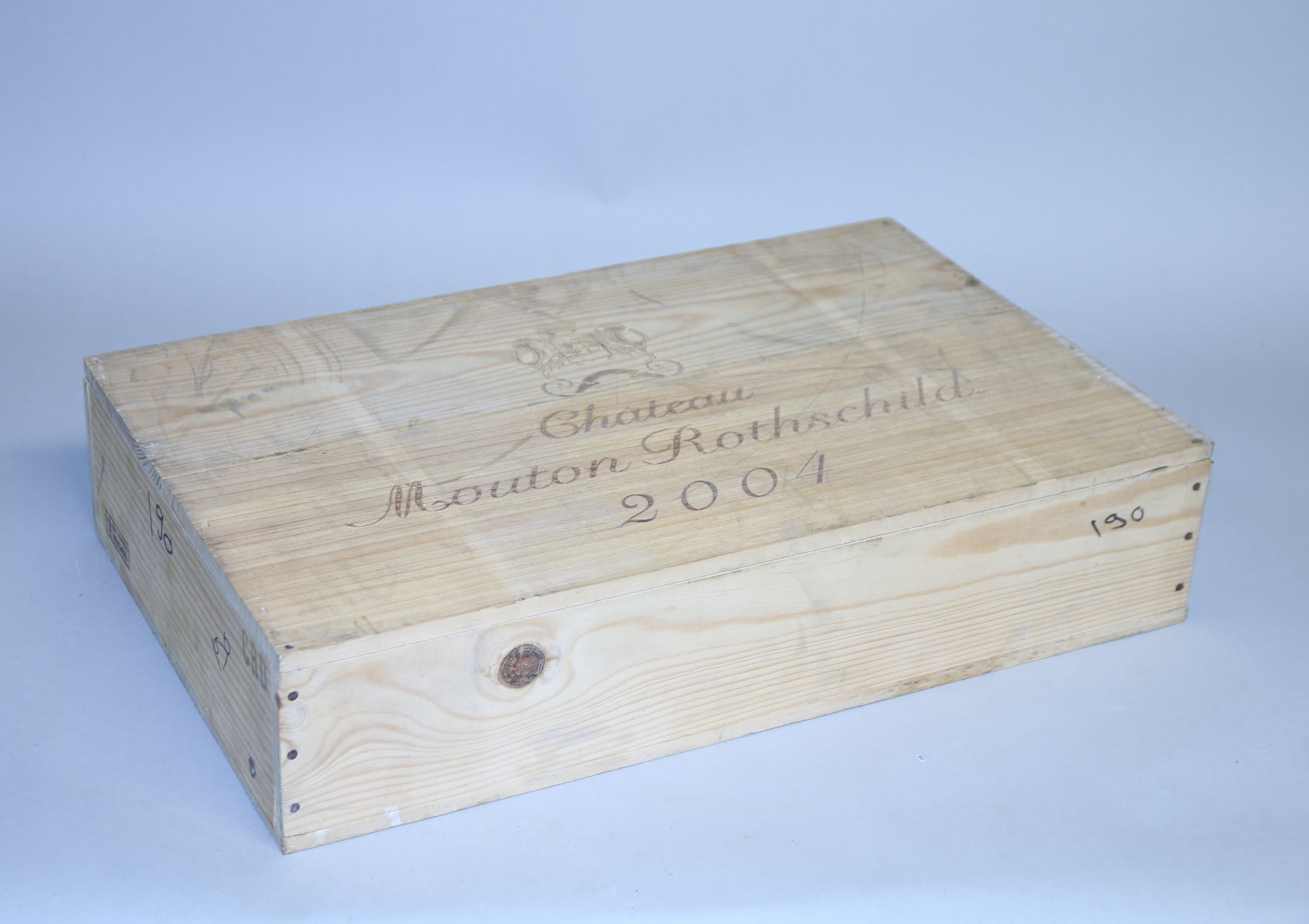 Pauillac, Château Mouton Rothschild, 1er Grand Cru classé, 2004, 3 bouteilles. Caisse de 6 ouverte (numérotation au feutre).