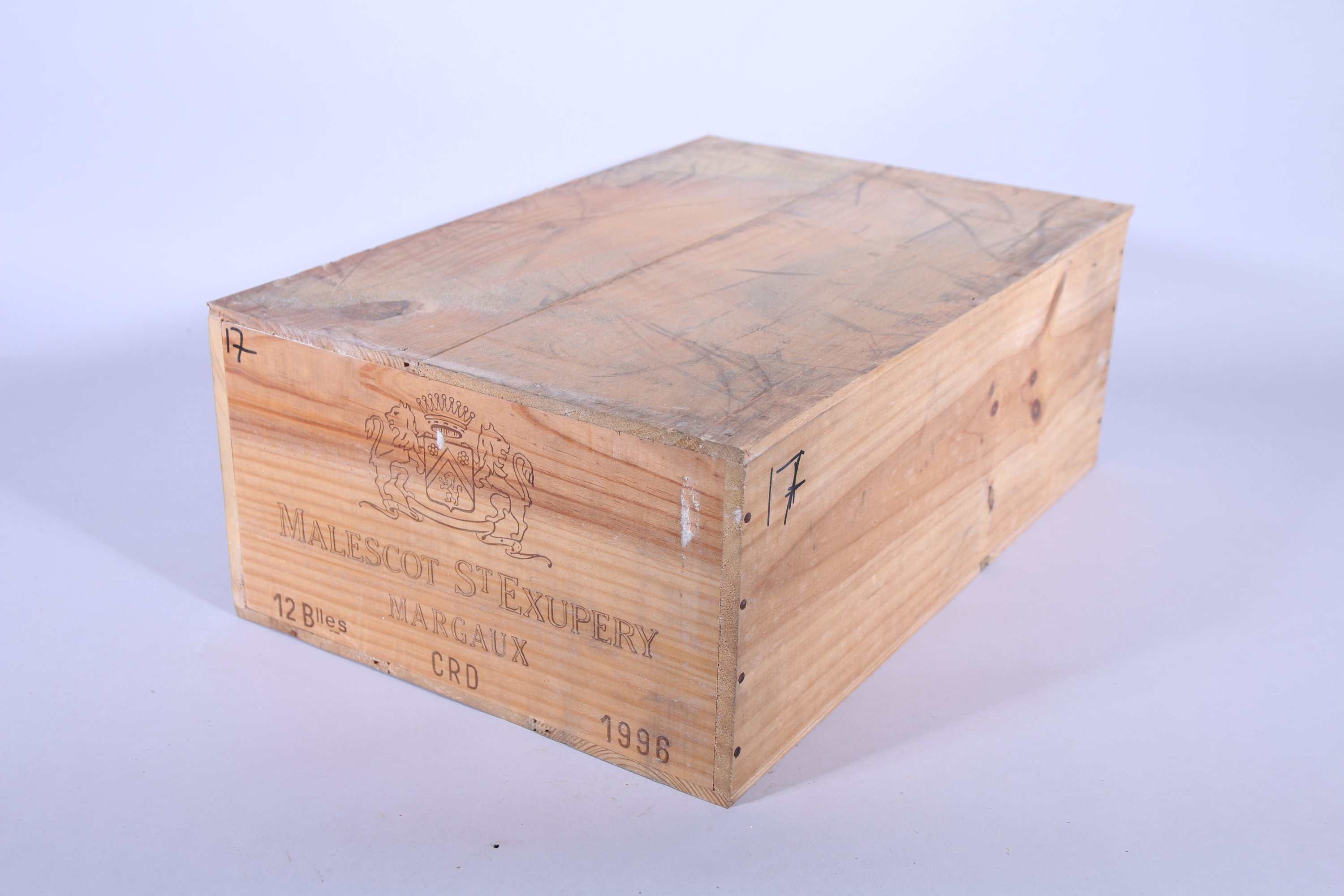 Margaux, Château Malescot Saint Exupery, 3ème Grand Cru classé, 1996, 12 bouteilles. Caisse en bois d'origine (numérotation au feutre).
