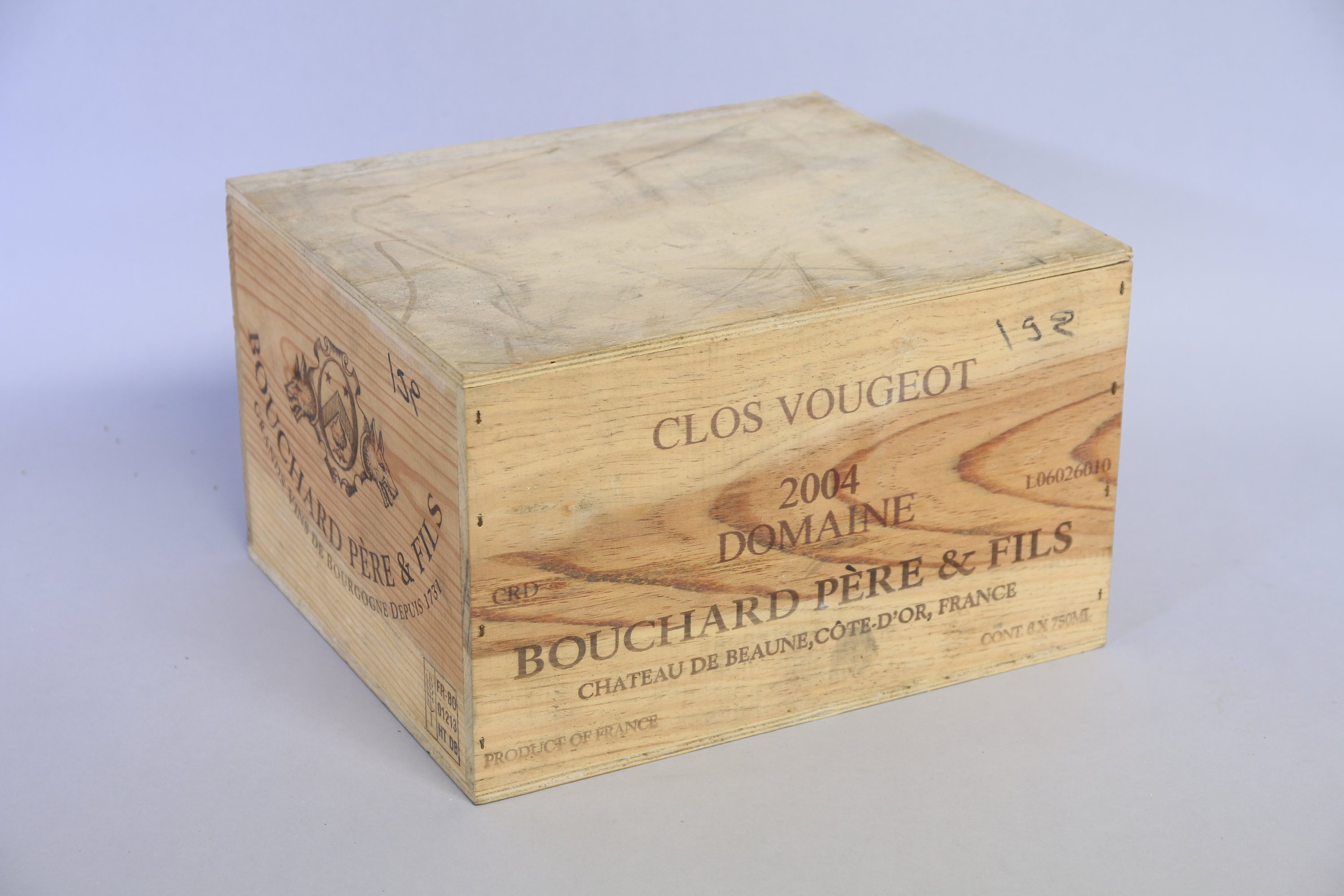 Clos Vougeot, Bouchard Père et Fils, 2004, 6 bouteilles. Caisse en bois d'origine (numérotation au feutre).