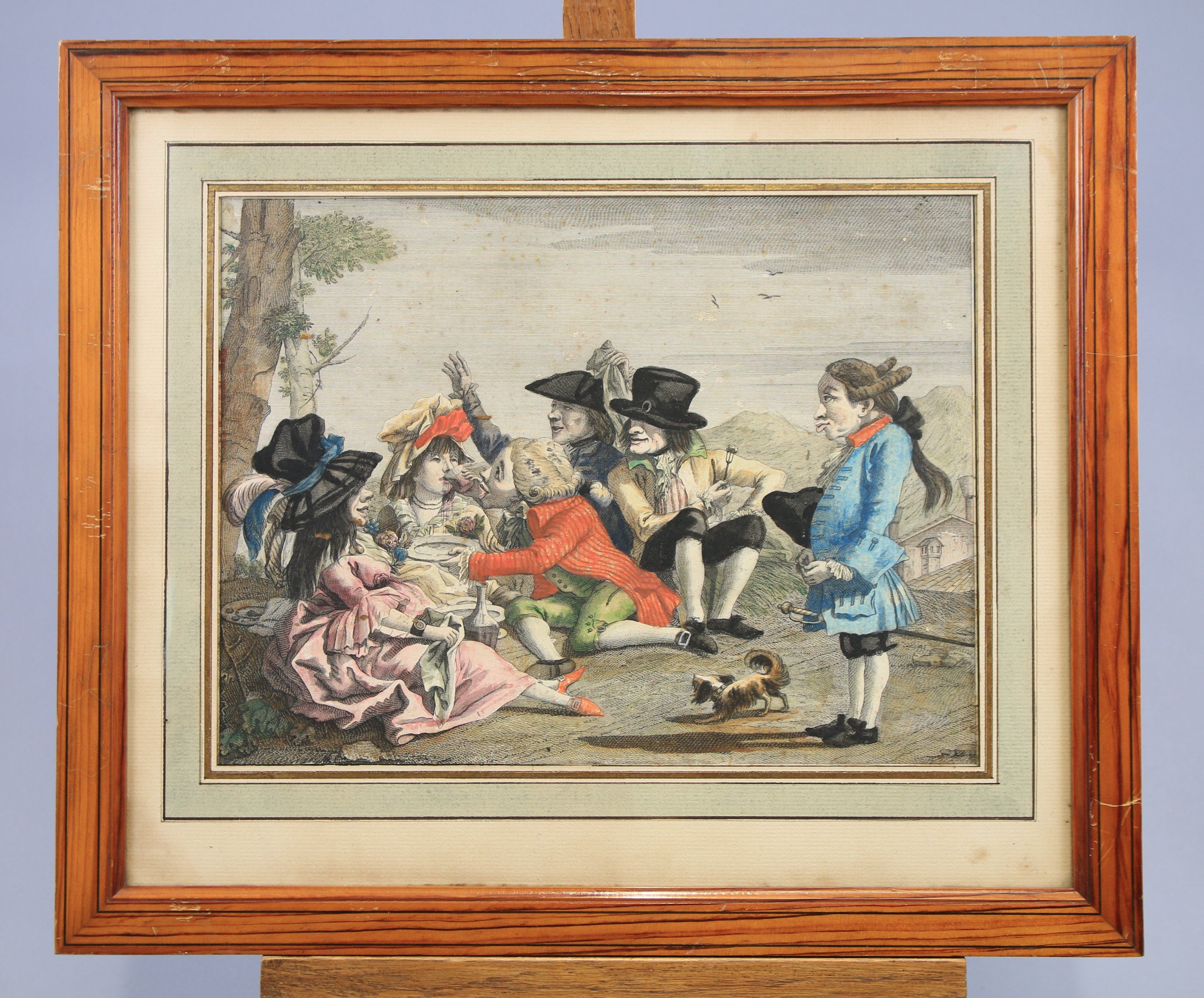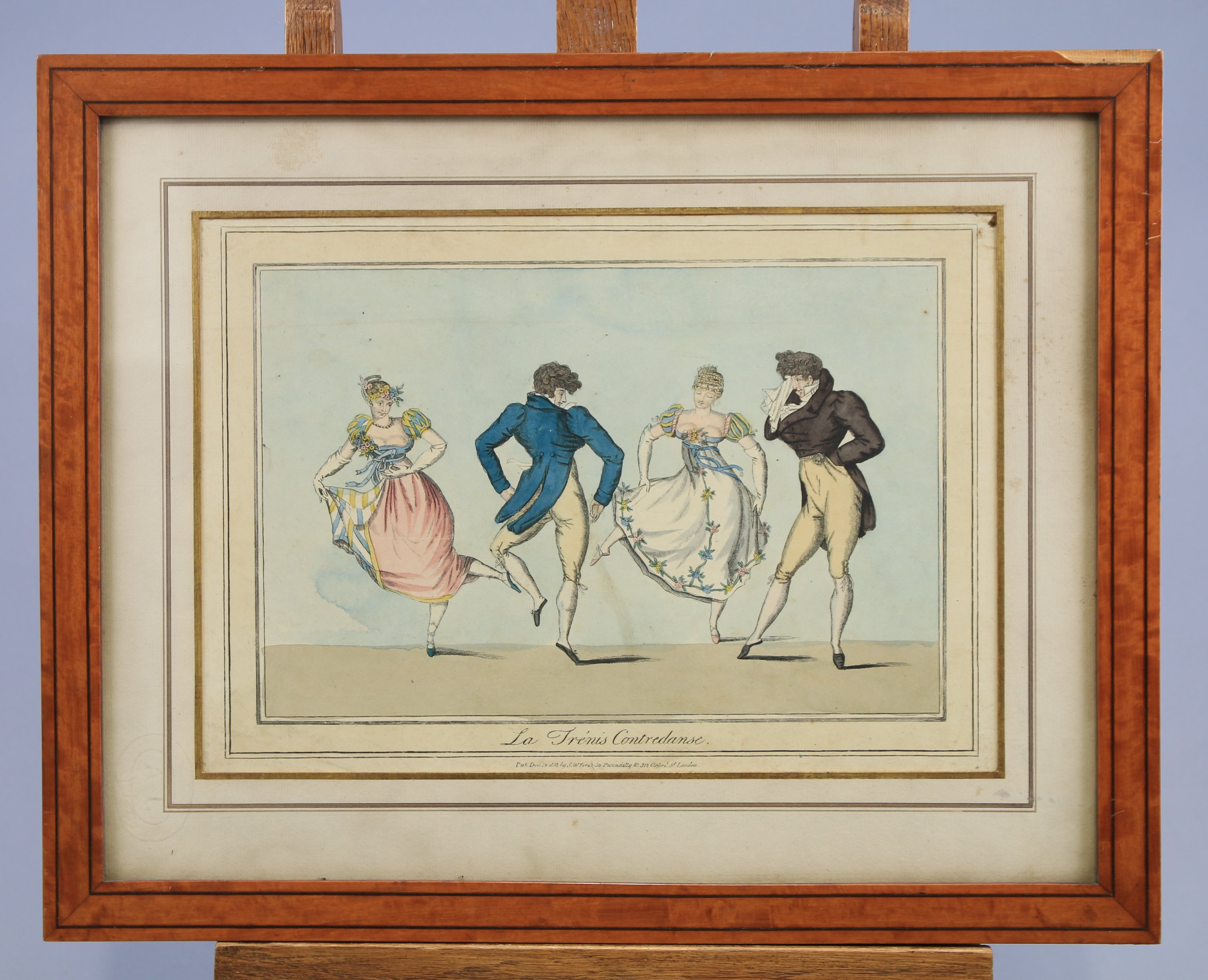Joints : Ecole du XIXe siècle, "La Trémis Contredanse", eau-forte en couleurs, planche éditée à Londres d'après l'ouvrage de Pierre de La Mésangère. Haut. 19 Larg. 28 cm. Cadre en place (Haut. 36,5 Larg. 48 cm, petits manques).