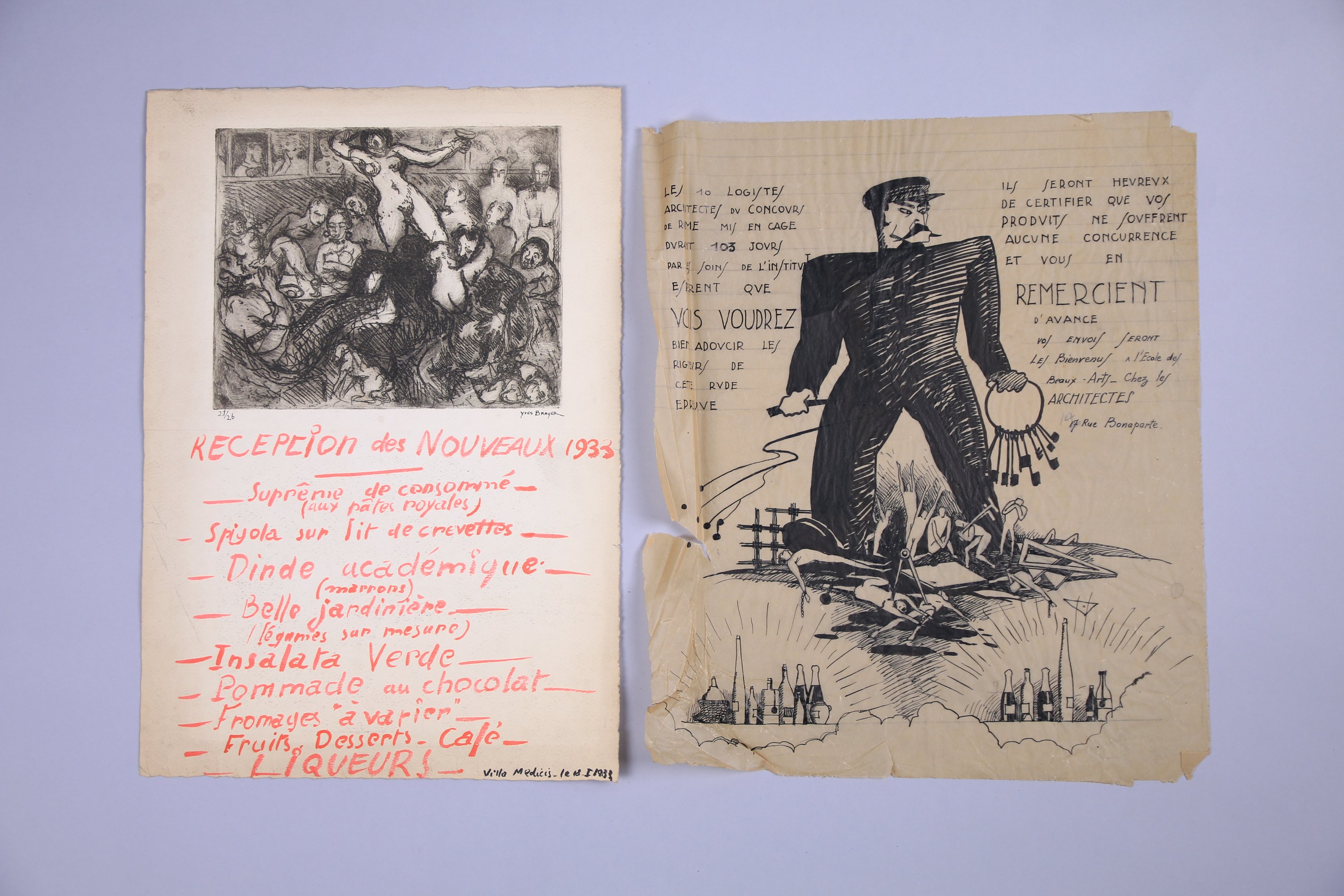 - Deux affiches "Grand Prix de Rome 1929. Les dix logistes du concours de Rome architecture, enfermés durant 103 jours pour une rude épreuve sont prêts à certifier que vos produits ne souffrent aucune concurrence. Morale Les Dix Logistes recevront volontiers vos gracieux envois dans leur loge (section architecture) Ecole des Beaux-Arts, rue Bonaparte. Ils vous remercient foutrement d'avance". Haut. 27,5 Larg. 37,5 cm ;