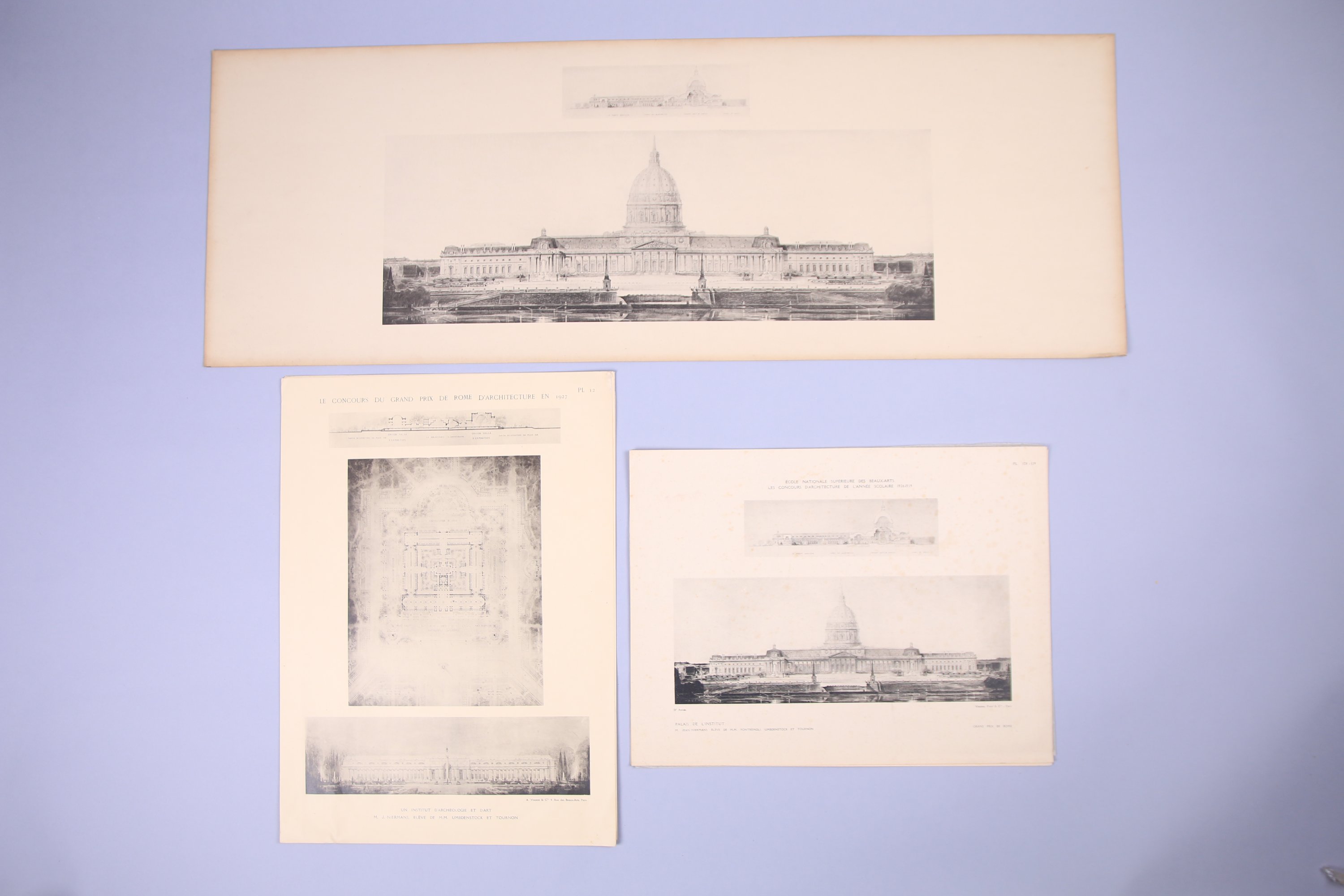 - D'après Jean Niermans (Français, 1897-1889), Palais de l'Institut pour le concours d'architecture de l'année scolaire 1928-1929. Six planches gravées en deux tailles. Feuille : Haut. 29,5 Larg. 39,5 cm et Haut. 32 Larg. 90 cm.