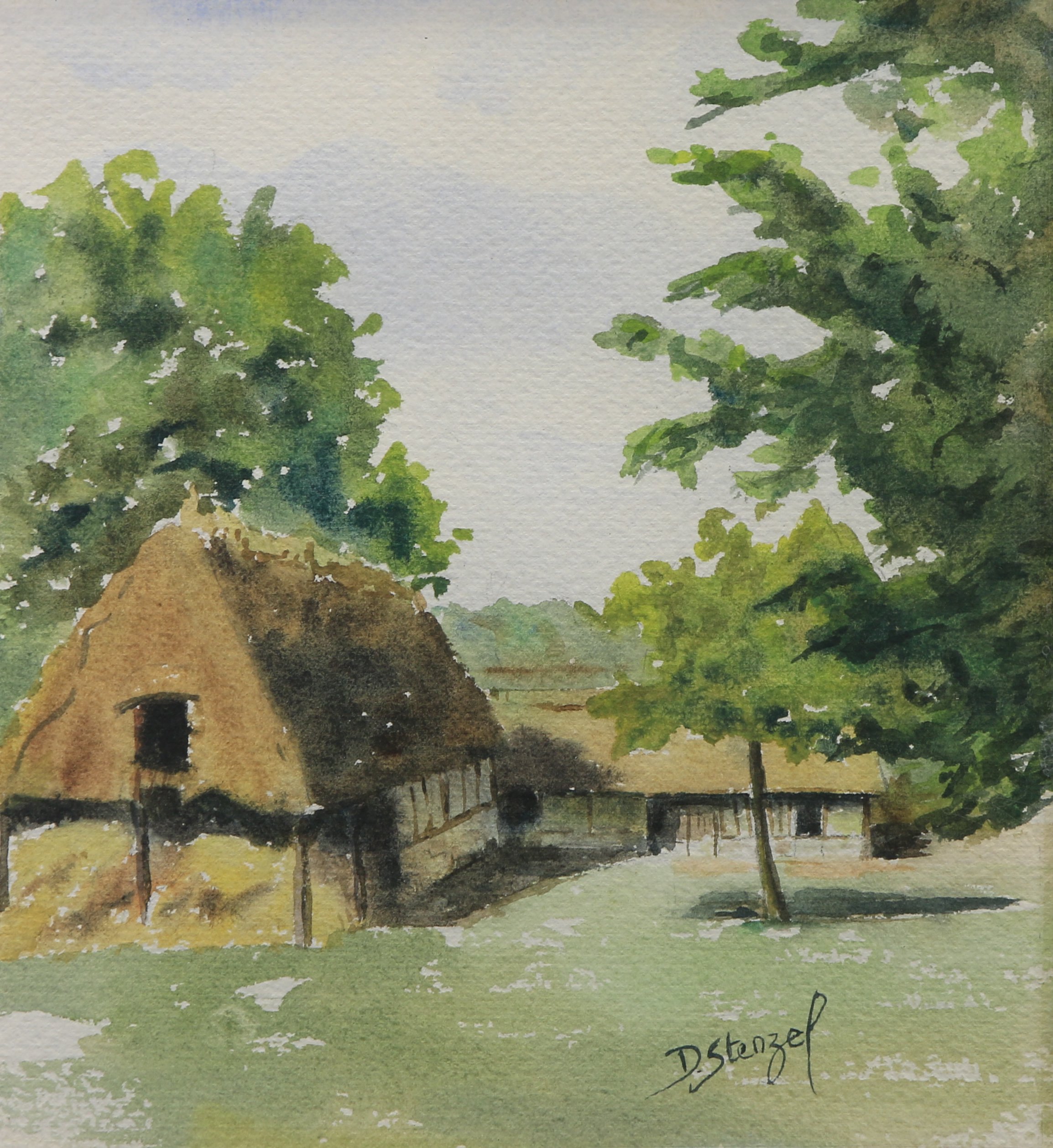 - Ecole du XXème siècle, Bord de rivière et Vue d'une chaumière. Aquarelles sur papier signées en bas à droite "D. Stenzel".