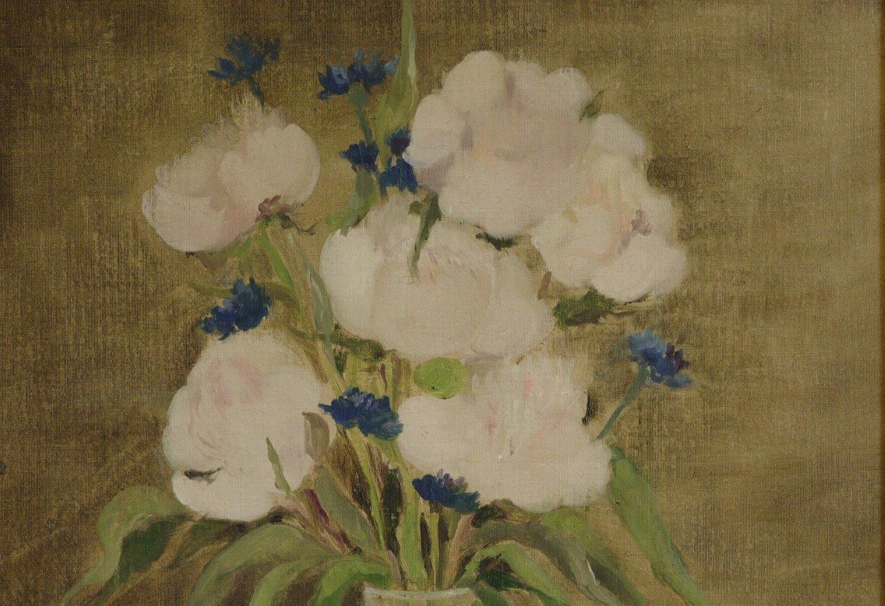 - André Brauneker (Français, né en 1926), Bouquet de fleurs, 1968, Toile marouflée. Signée et datée en bas à droite. Haut. 50 Larg. 60,5 cm. Cadre en bois et tissus (Haut. 77 Larg. 66 cm).