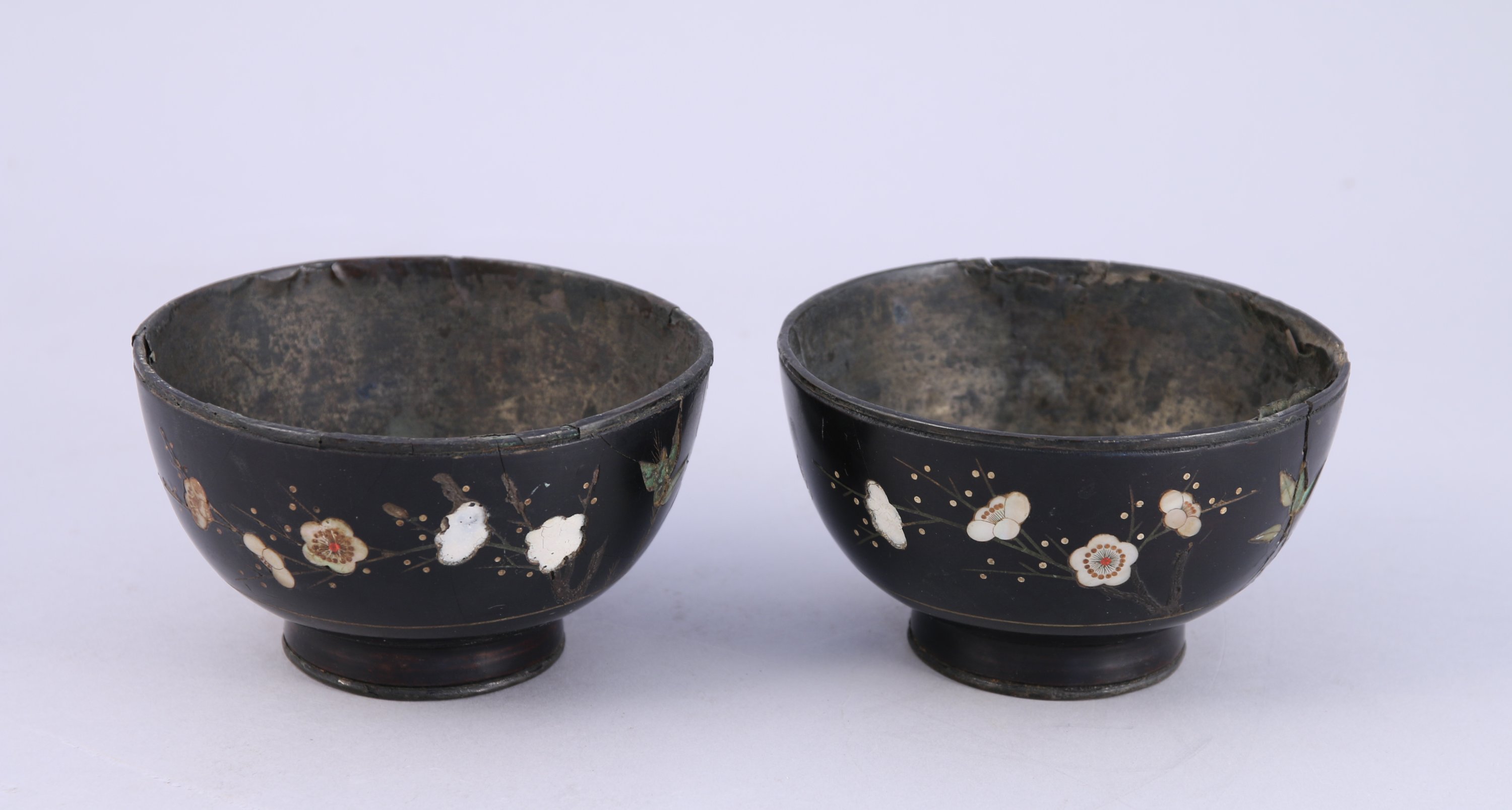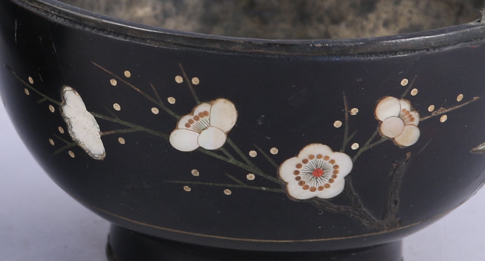 A décor incrusté de stéatite et nacre de branches de cerisiers en fleurs, papillons et bambous. L'intérieur avec une feuille d'argent.