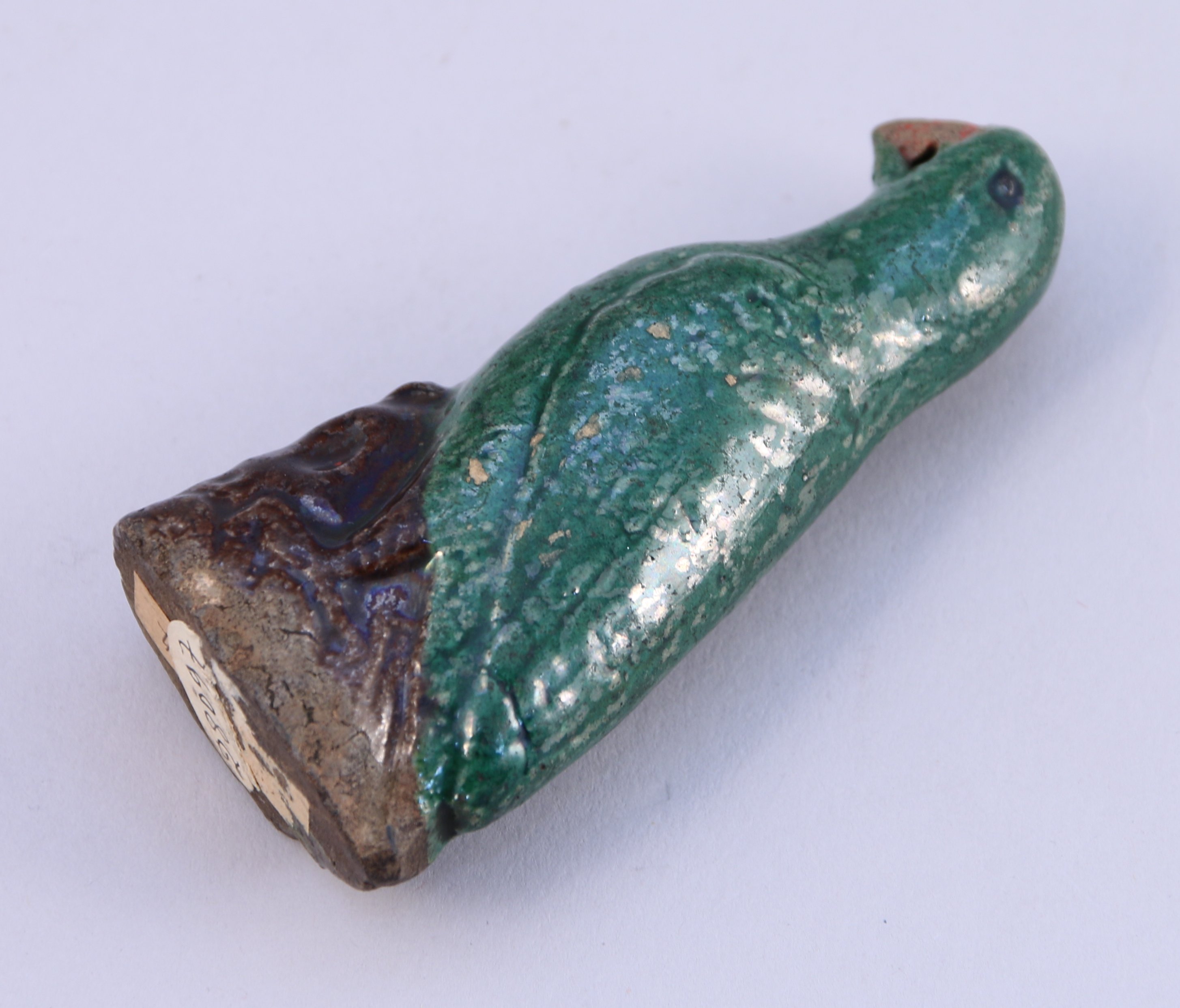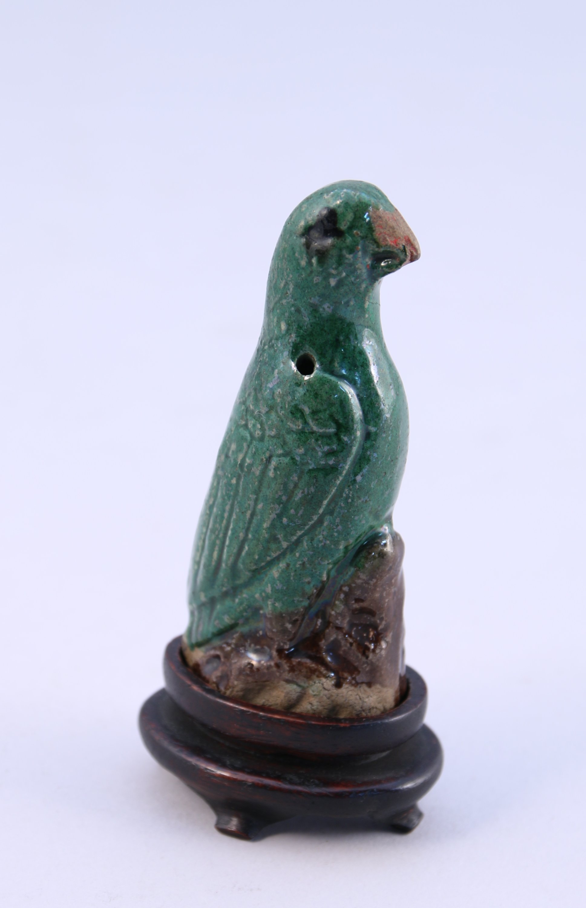 Joint : Chine, époque Kangxi (1662-1722). Petit perroquet en porcelaine émaillée vert et manganèse sur biscuit. Haut. 9 cm.